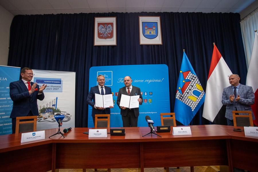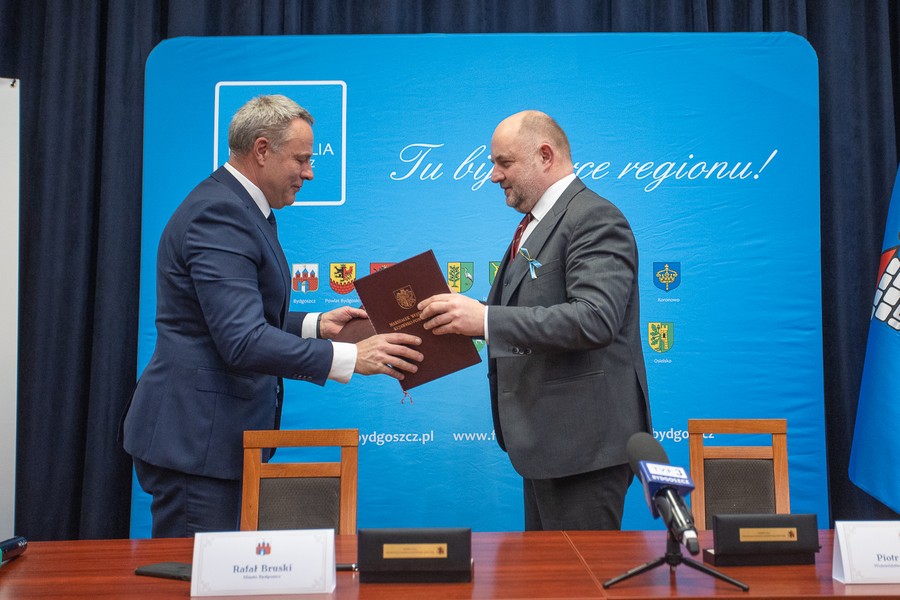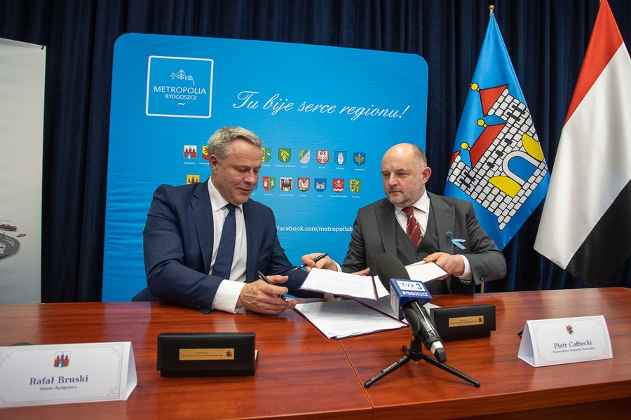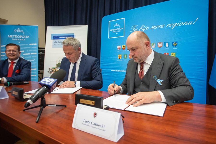 Marszałek Piotr Całbecki i reprezentujący związek Zintegrowane Inwestycje Terytorialne Bydgoskiego Obszaru Funkcjonalnego (ZIT BydOF ) prezydent Bydgoszczy Rafał Bruski podpisali porozumienie, na mocy którego samorząd miejski Bydgoszczy będzie de facto zarządzał środkami naszego nowego programu regionalnego 2021-2027 dla obszaru Metropolii Bydgoszcz (Bydgoszcz oraz 19 powiatów i gmin w środkowozachodniej części regionu). Miasto Bydgoszcz, jako instytucja pośrednicząca w ramach Funduszy Europejskich dla Kujaw i Pomorza (FEdKP), dysponować będzie 104 milionami euro.