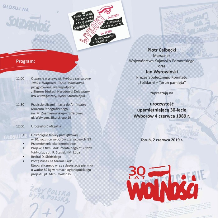 Obchodzimy 30. rocznicę wyborów czerwcowych 1989 roku, od których rozpoczęła się droga naszego kraju ku demokracji i otwarciu gospodarczemu. Oficjalne wydarzenia, z udziałem marszałka Piotra Całbeckiego i przewodniczącego Społecznego Komitetu Solidarni – Toruń Pamięta marszałka Jana Wyrowińskiego, odbyły się 2 czerwca w Toruniu. Przed Urzędem Marszałkowskim można obejrzeć prawdziwą podziemną drukarnię z tamtego czasu.