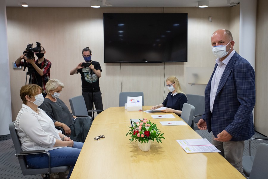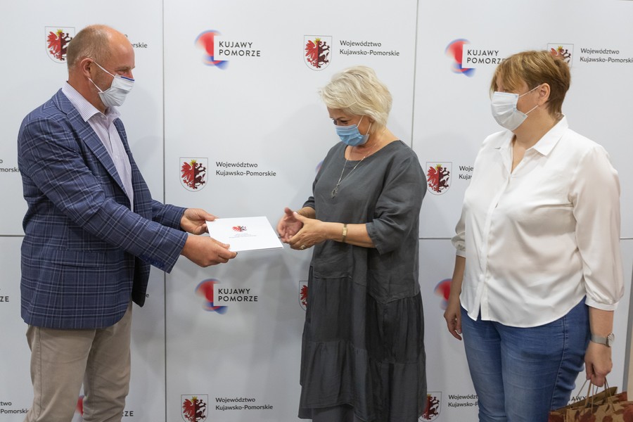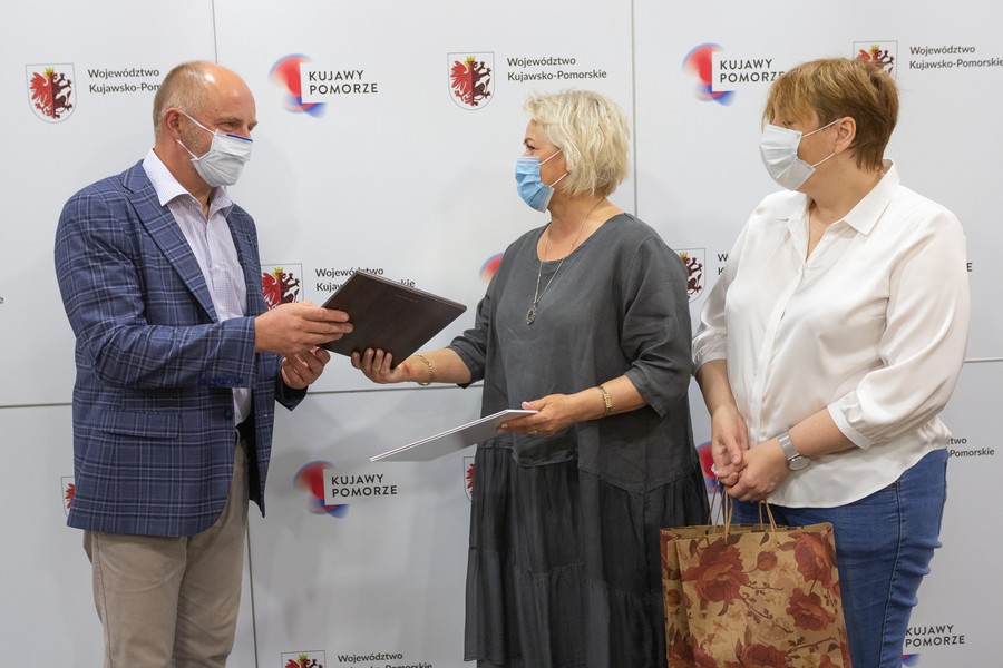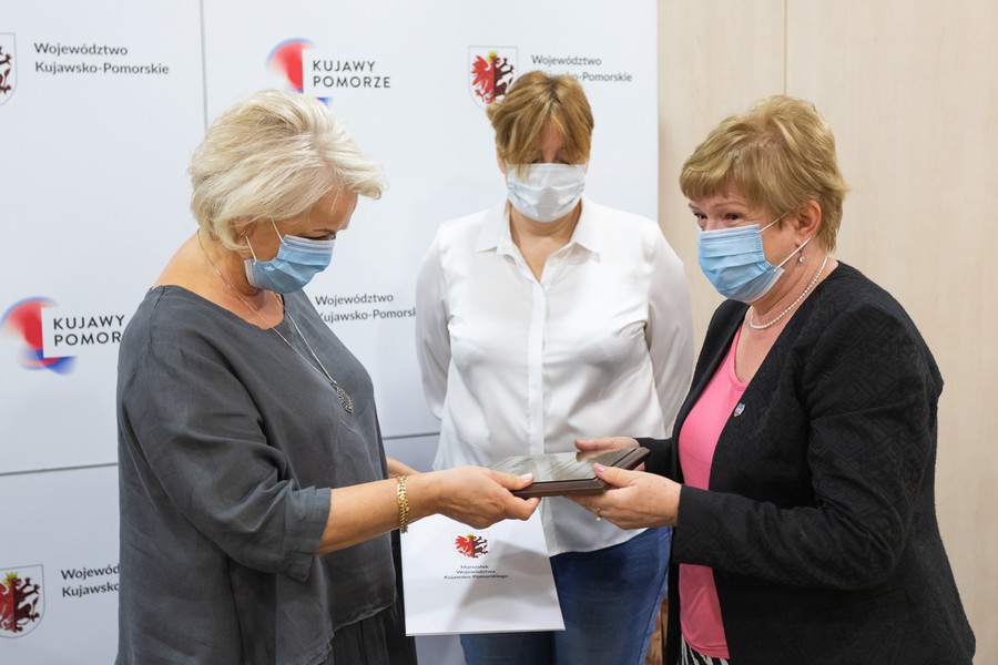 Marszałek Piotr Całbecki oraz towarzysząca mu podczas spotkania dyrektor Departamentu Spraw Społecznych w Urzędzie Marszałkowskim Krystyna Żejmo-Wysocka zostali wyróżnieni przez Fundację Pomoc Rodzinie i Ziemi honorowym tytułem Ambasadora Dziecięcych Serc.
