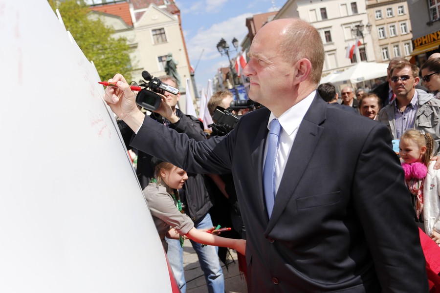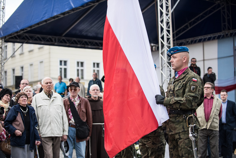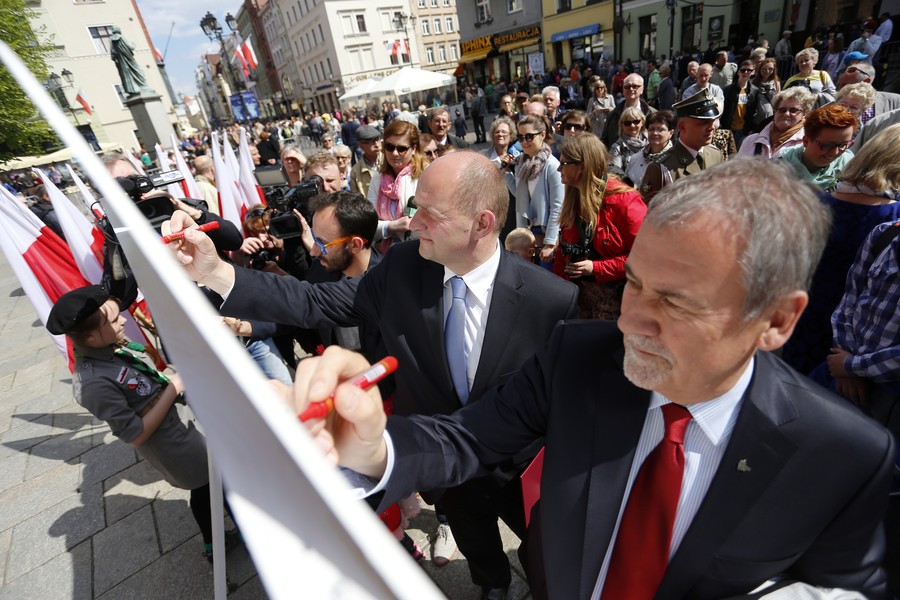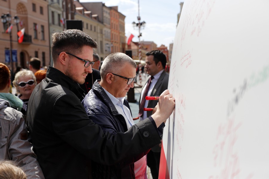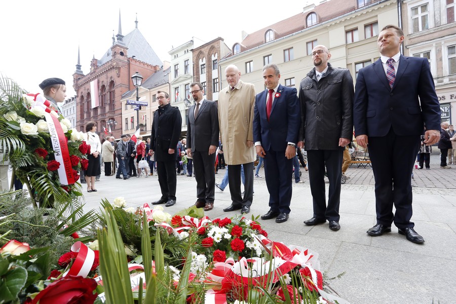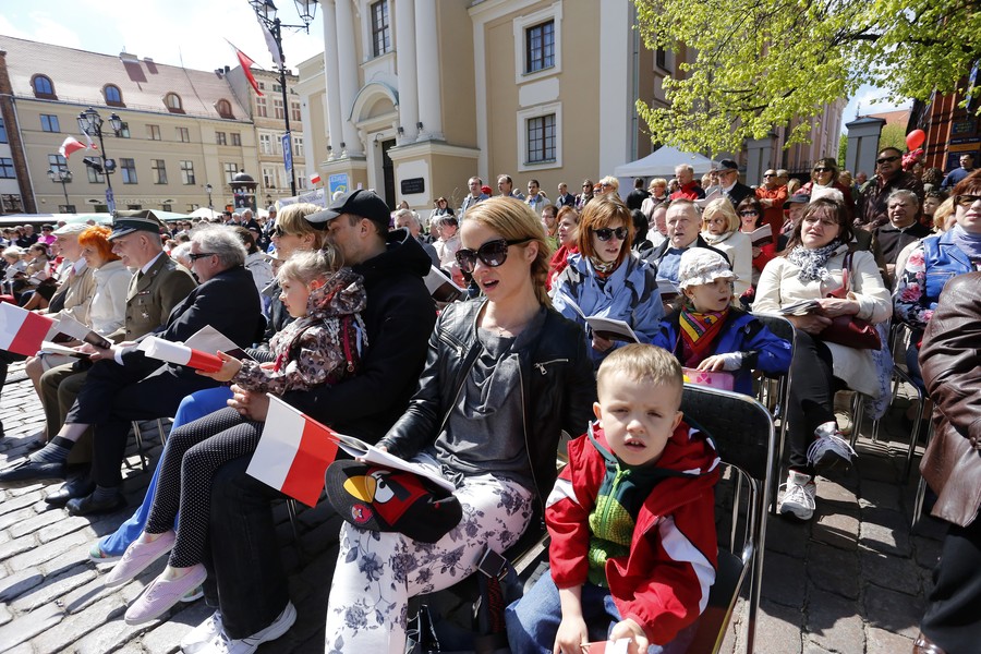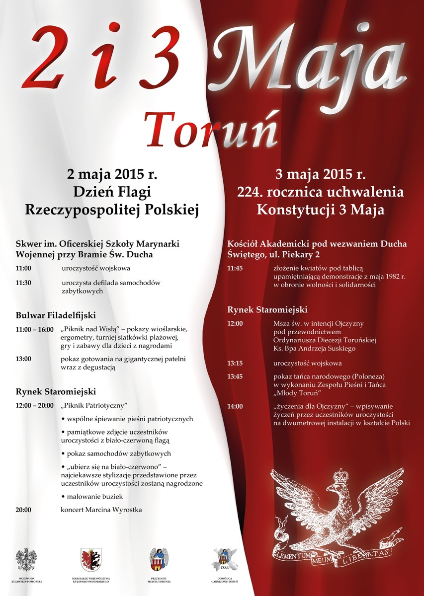 Niedzielne (3 maja) obchody Święta Narodowego Trzeciego Maja rozpoczną się uroczystą mszą świętą na Rynku Staromiejskim pod przewodnictwem biskupa Andrzeja Suskiego. Wcześniej uczestnicy uroczystości złożą kwiaty pod tablicą przy kościele Św. Ducha w hołdzie obywatelom Torunia, którzy w wielotysięcznych demonstracjach 1 i 3 maja 1982 roku odważnie wystąpili w obronie wolności i solidarności. Po mszy odbędzie się uroczystość wojskowa, a po niej „Poloneza” zatańczą członkowie Zespołu Pieśni i Tańca „Młody Toruń”. O godzinie 14 odbędzie się akcja „Życzenia dla Ojczyzny”, podczas której uczestnicy uroczystości będą składać wpisy na dwumetrowej instalacji w kształcie Polski. W niedzielnych obchodach będzie uczestniczył marszałek Piotr Całbecki