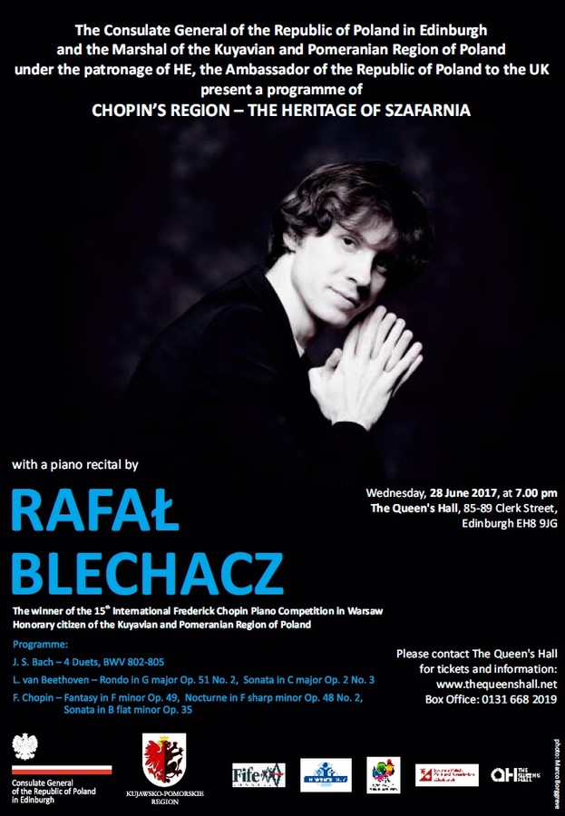 Rafał Blechacz, związany z Kujawsko-Pomorskiem światowego formatu wirtuoz fortepianu, zagrał 28 czerwca w Edynburgu Chopina, a także Bacha i Beethovena. Organizatorem koncertu, który jest elementem wizerunkowej kampanii promocyjnej regionu, był samorząd województwa. Wydarzeniu patronował ambasador RP w Londynie Arkady Rzegocki.