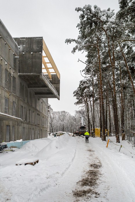 Nowy budynek główny lecznicy – gmach w kształcie litery H, połączony z istniejącym budynkiem głównym – będzie sercem szpitala, mieszącym między innymi oddział ratunkowy, oddział kardiologii inwazyjnej, główny blok operacyjny szpitala i cztery oddziały łóżkowe. Już teraz prezentuje się imponująco. Ekipy budowlane kontynuują roboty wykończeniowe w zachodniej części obiektu – m. in. stawiają ściany działowe na poszczególnych kondygnacjach i montują stolarkę okienną, rozpoczęły też montaż systemów wentylacyjnych. Budowa części wschodniej jest mniej zaawansowana – tu trwają betonowanie i zbrojenie ścian oraz roboty murarskie w piwnicach, na parterze oraz na pierwszym i drugim piętrze.