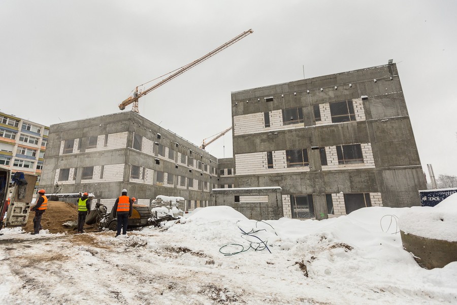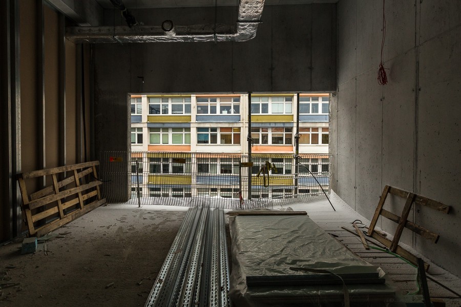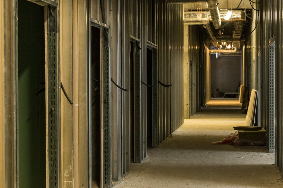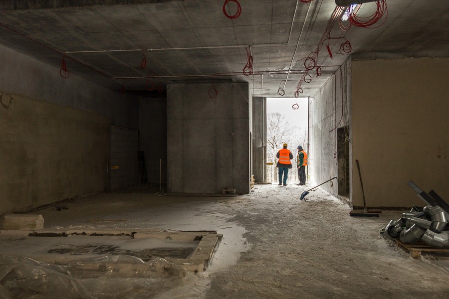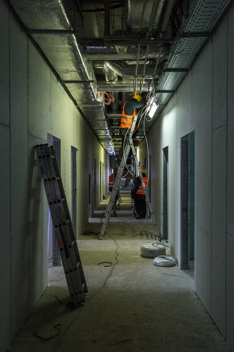 W budynku, w którym będą się mieścić administracja i apteka placówki oraz magazyn odpadów medycznych i prosektorium, zakończono już tynkowanie, obecnie montuje się tu windy i kładzie posadzki.