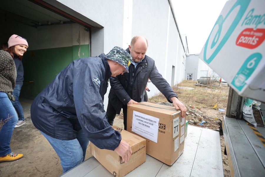 Вчора (6 квітня) до Торуня прибули дари для українців, які зібрали жителі графства Файф у Великобританії. У другій половині дня маршал Пьотр Цалбецкі зустрівся з британськими волонтерами, серед яких ініціаторка акції, радник Файф Мері Локхарт і Джим Лейшман, голова ради округу Файф.