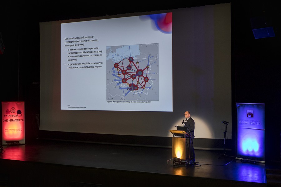 Puentą wystąpienia była refleksja na temat udziału miasta w budowaniu wzrostu gospodarczego i pomyślności regionu: – W dyskusji o przyszłości miasta muszą zadać sobie państwo pytanie, czy Bydgoszcz chciałaby odgrywać większą, i jeśli tak to jaką, rolę dla całego województwa. Rolą metropolii, ich cechą uniwersalną, właściwą dla silnych ośrodków metropolitalnych na całym świecie, jest to, że są to ośrodki, które promieniują na zewnątrz. Myślę, że Bydgoszcz powinna się w tej roli znaleźć. To wyzwoli pokłady ambicji mieszkańców i państwa, którzy decydujecie o losach miasta. W strategii zapiszecie wtedy odważne punkty, a realizacja da wiele satysfakcji i korzyści dla naszego województwa.