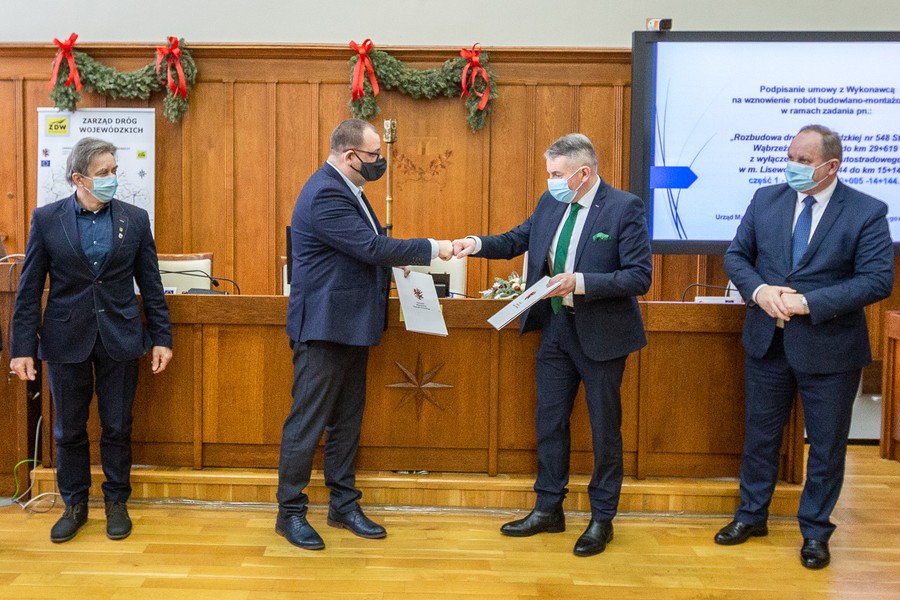 Umowę na realizację inwestycji podpisali dyrektor Zarządu Dróg Wojewódzkich w Bydgoszczy Przemysław Dąbrowski i reprezentujący wykonawcę, konsorcjum Kobylarnia SA i Mirbud, członek zarządu Sławomir Nowak. Obecni byli również radny województwa Tadeusz Pogoda, starosta wąbrzeski Krzysztof Maćkiewicz i wójt gminy Lisewo Jakub Kochowicz.