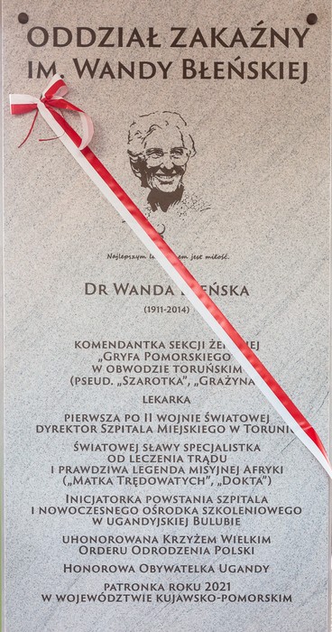 Imię doktor Wandy Błeńskiej, związanej z naszym regionem lekarki i społeczniczki, nosi nowy pawilon oddziału zakaźnego w Wojewódzkim Szpitalu Zespolonym w Toruniu. Poświęconą Dokcie tablicę w kompleksie lecznicy odsłoniła 22 grudnia jej przyjaciółka Beata Chomicz w asyście marszałka Piotra Całbeckiego, przewodniczącej sejmiku województwa Elżbiety Piniewskiej, biskupa toruńskiego Wiesława Śmigla oraz dyrekcji lecznicy i kierownictwa jednostki.