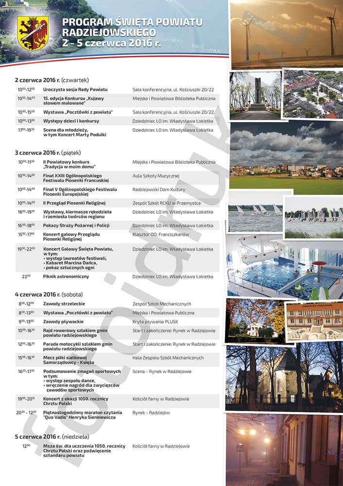 W programie Święta Powiatu Radziejowskiego znalazły się między innymi konkursy i przeglądy piosenek, zawody strzeleckie i pływackie, rajd rowerowy i parada motocykli szlakami gmin powiatu radziejowskiego, maraton czytania „Quo Vadis” Henryka Sienkiewicza, a także koncert galowy i piknik astronomiczny. W niedzielę (5 czerwca) odbędzie się msza święta dla uczczenia 1050 rocznicy chrztu Polski oraz poświęcenie sztandaru powiatu. Większość imprez zaplanowano na dziedzińcu Liceum Ogólnokształcącego im. Władysława Łokietka oraz na radziejowskim Rynku.