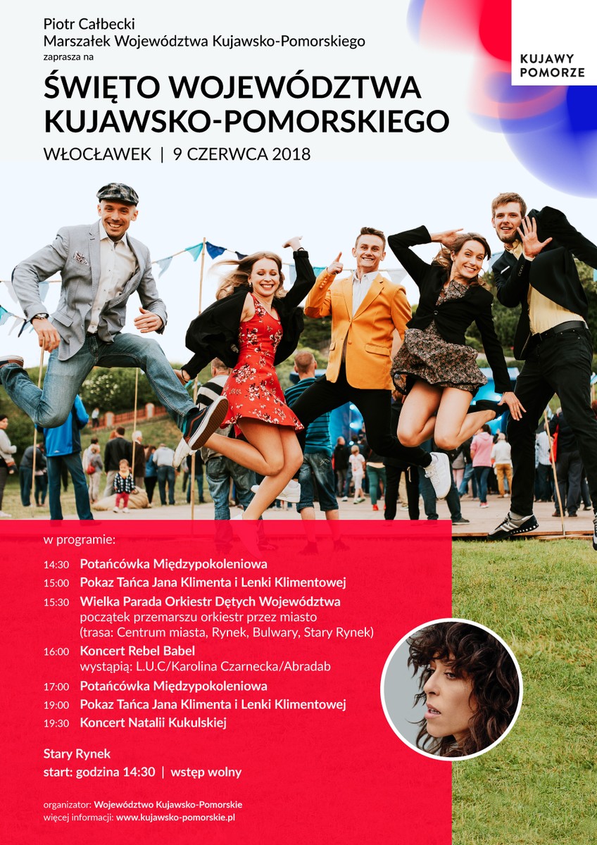 - sobota (9 czerwca, początek o godzinie 14.30) – Na Starym Rynku zorganizowaliśmy między innymi Potańcówkę Międzypokoleniową, pokaz tańca Jana Klimenta i Lenki Klimentowej, Wielką Paradę Orkiestr Dętych Województwa, koncert Rebel Babel (wystpią L.U.C/Karolina Czarnecka/Abradab) oraz koncert Natalii Kukulskiej.