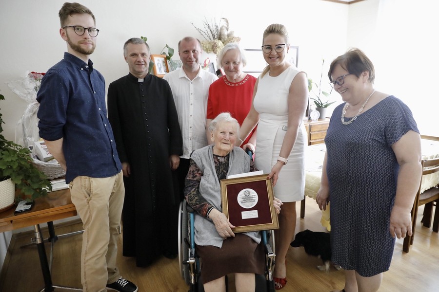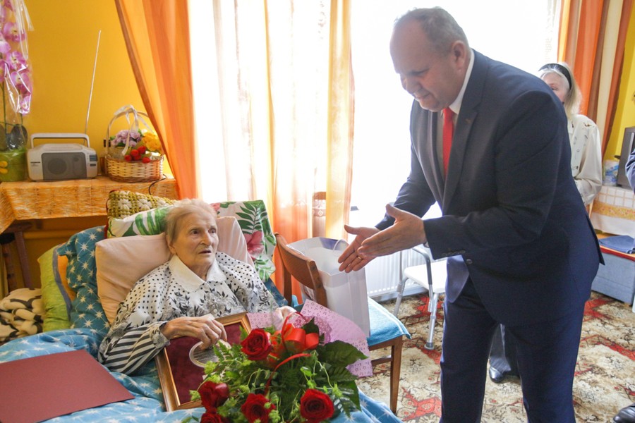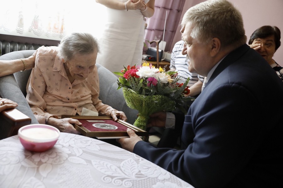 Medal wręczył nestorce wicemarszałek Zbigniew Sosnowski. W uroczystości wzięli udział burmistrz Radzynia Chełmińskiego Krzysztof Chodubski i Krystyna Smolińska z radzyńskiego biura ewidencji ludności.