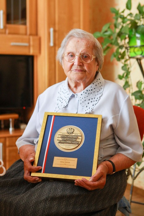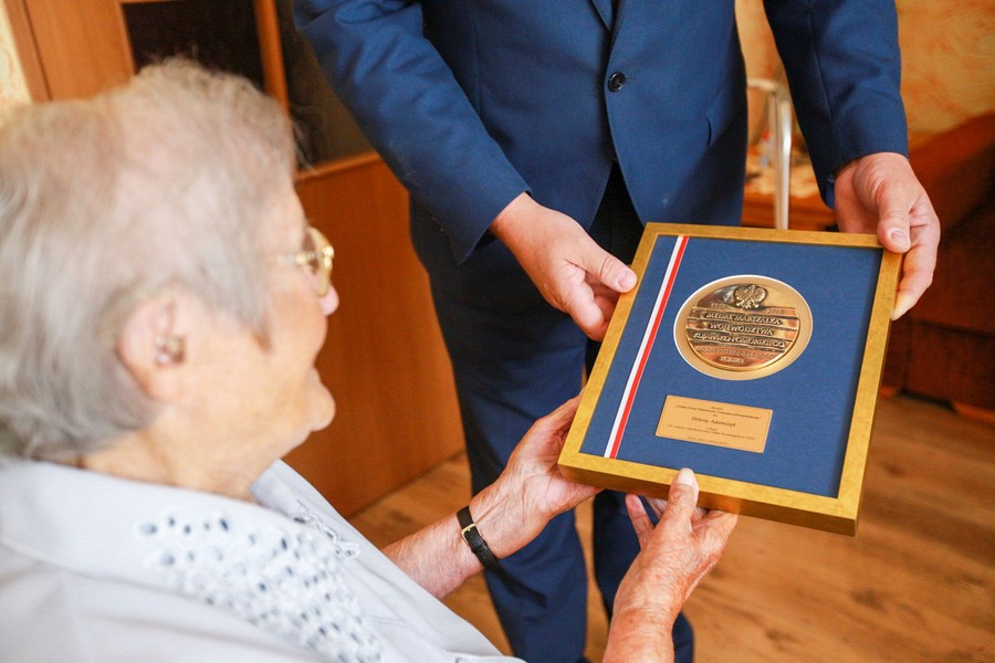 Pani Helenie marszałek Całbecki wręczył wybity z okazji setnej rocznicy odzyskania niepodległości medal Unitas Durat Palatinatus Cuiaviano-Pomeraniensis. Podczas rozmowy życzył zdrowia i kolejnych lat życia, także wysłuchał jej historii. Biogram Heleny Adamczyk.
