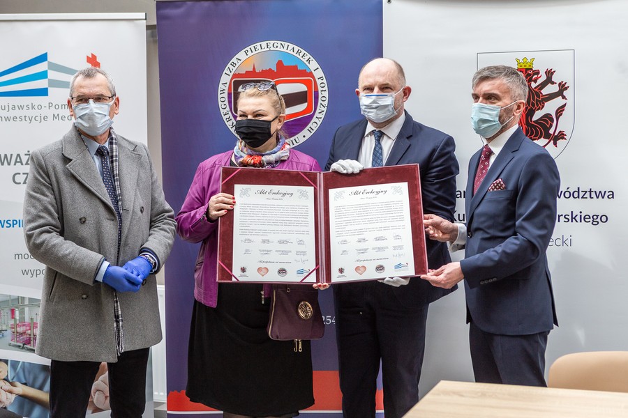 W połączonej z wmurowaniem aktu erekcyjnego ceremonii uczestniczyli też m.in. prezydent Torunia Michał Zaleski i prezes Kujawsko-Pomorskich Inwestycji Medycznych (KPIM) Aleksander Szczęsny; KPIM, marszałkowska spółka celowa, wspierała w procesie inwestycyjny izbę pielęgniarską.