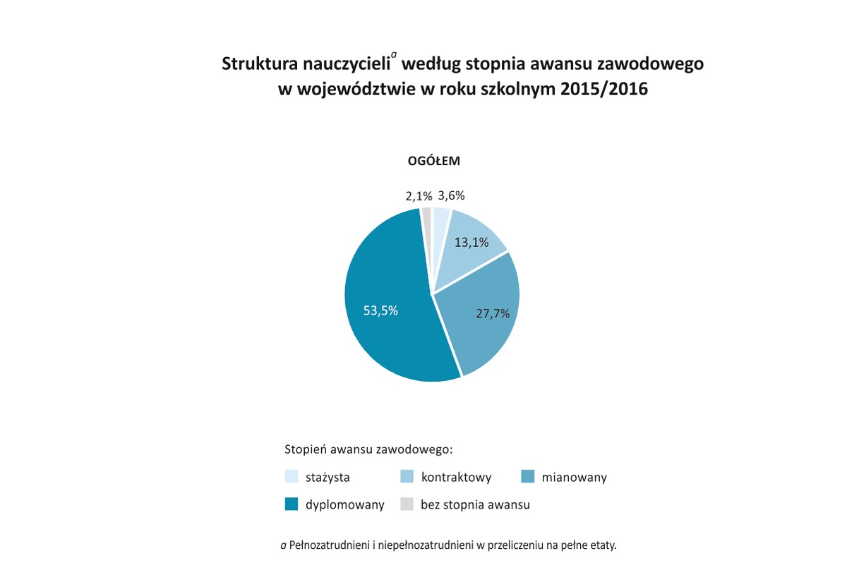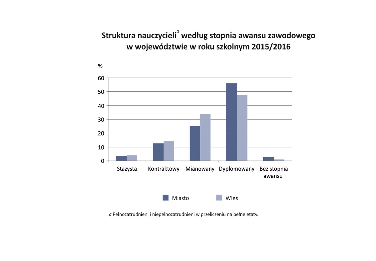 Ponad połowa wszystkich kujawsko-pomorskich nauczycieli osiągnęła najwyższy jak dotychczas stopień awansu zawodowego – są nauczycielami dyplomowanymi. Co ciekawe, więcej przedstawicieli tej grupy pracuje na wsi (o 9 proc.), choć generalnie zatrudnienie w szkołach miejskich jest większe (70 proc. etatów). Drugą liczebnie grupą są nauczyciele mianowani (7,7 tysiąca etatów).