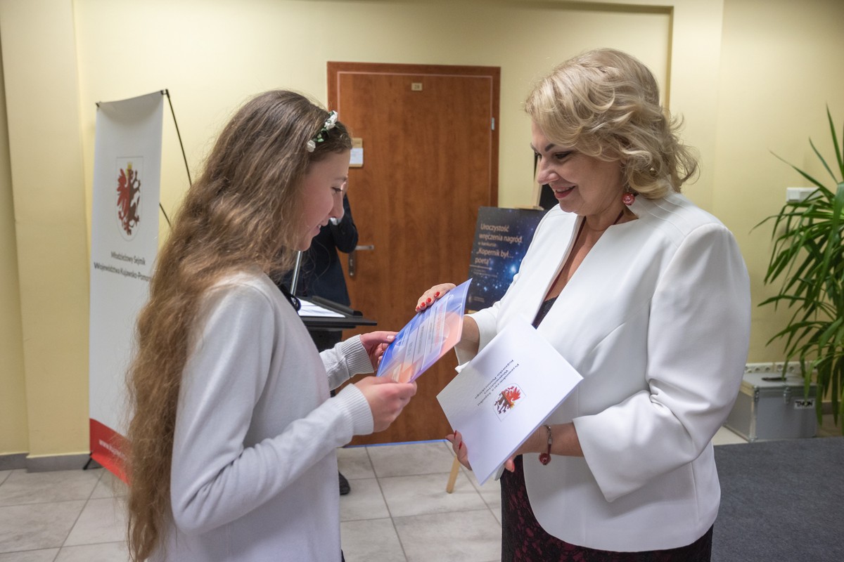 Przewodnicząca sejmiku województwa Elżbieta Piniewska wręczyła wczoraj (11 grudnia) nagrody zwycięzcom konkursu poetyckiego zorganizowanego przez samorząd województwa i marszałkowską Książnicę Kopernikańską. Próby literackie młodych twórców oceniali prezes Toruńskiego Klubu Poetów Wiesława Kwinto-Koczan i prof. Dariusz Pniewski z Instytut Literaturoznawstwa Uniwersytetu Mikołaja Kopernika.