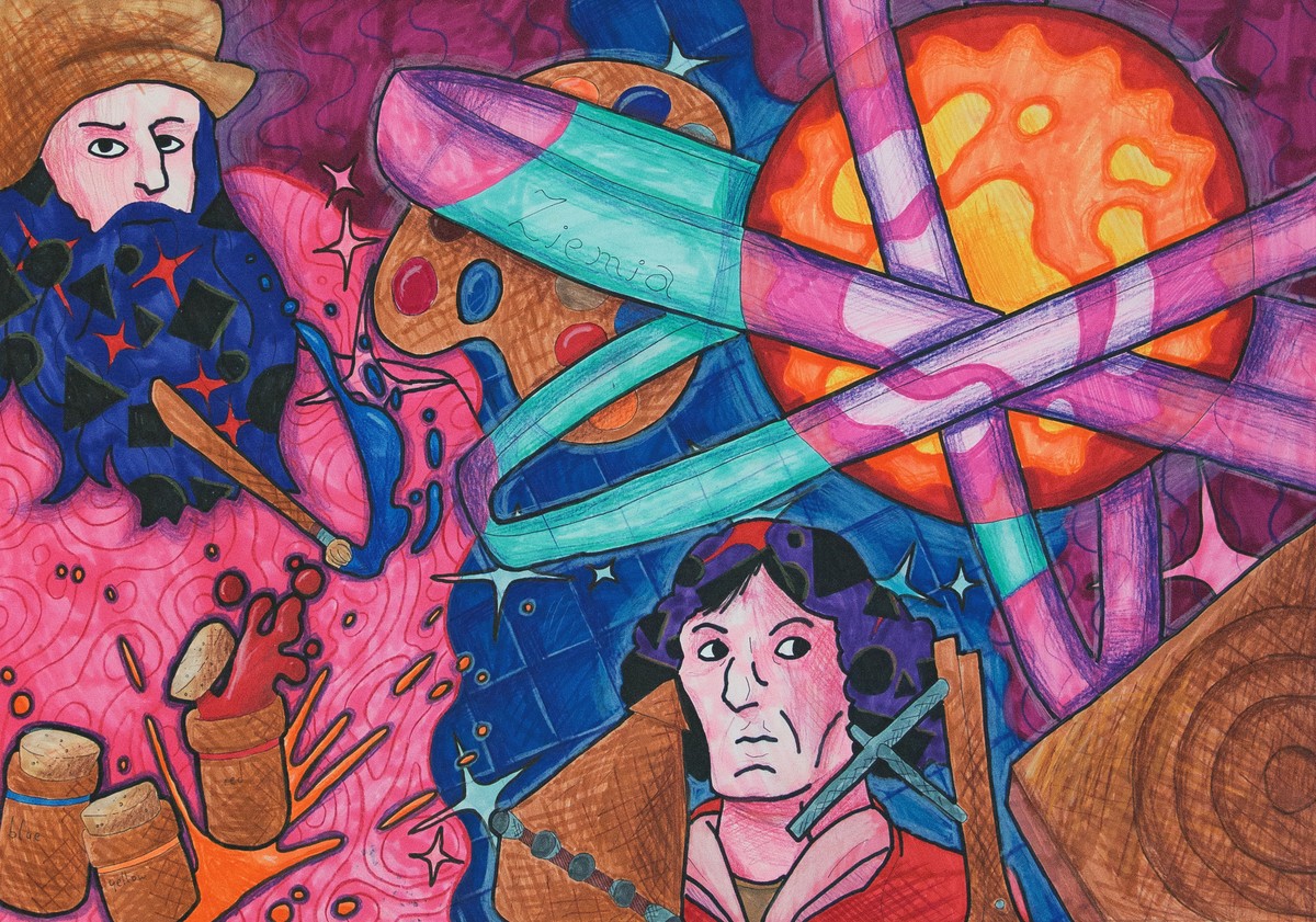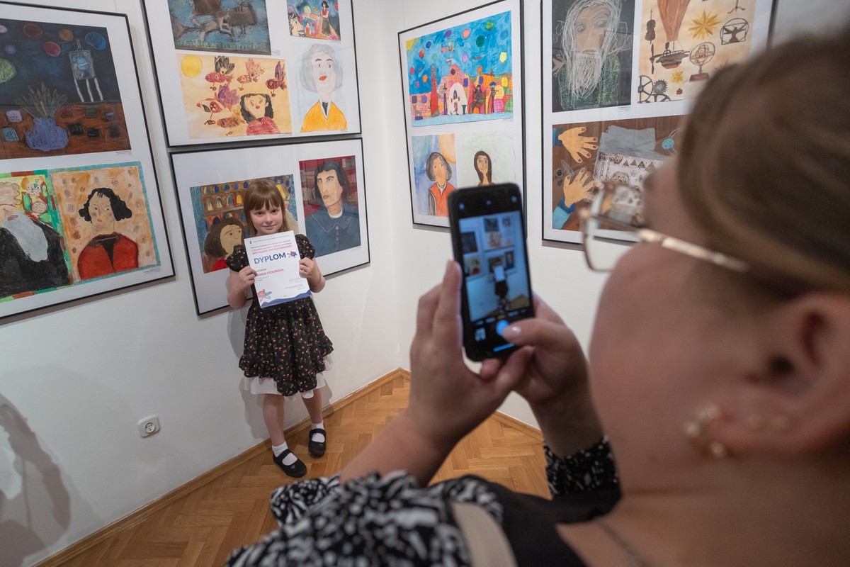 Takie wyimaginowane spotkanie stało się punktem wyjścia do zorganizowania konkursu. Jego owocem są prace, które możemy podziwiać na wystawie w toruńskiej Galerii i Ośrodku Plastycznej Twórczości Dziecka. Kilku- i kilkunastoletni autorzy prezentowanych tu kompozycji malarskich, rysunków i grafik zapraszają nas do świata swojej wyobraźni. Odsłaniają przed nami bogaty zbiór różnorodnych przedstawień, scen rodzajowych, pejzaży, a przede wszystkim portretów – barwnych wizerunków Mikołaja Kopernika i Leonarda da Vinci, którzy stają się niejako gospodarzami tej wystawy. Wspólnie przemierzamy ulice i place włoskich miast i miasteczek, odwiedzamy muzea, po drodze wstępujemy do pizzerii, gdzie Mikołaj zamawia dużą capricciosę, potem do pracowni Leonarda by obejrzeć ukończony właśnie portret pani Lisy. I jeszcze wizyta u fryzjera, partyjka szachów, wspólne oglądanie rozgwieżdżonego nieba. Inwencja twórcza młodych twórców jest naprawdę imponująca.