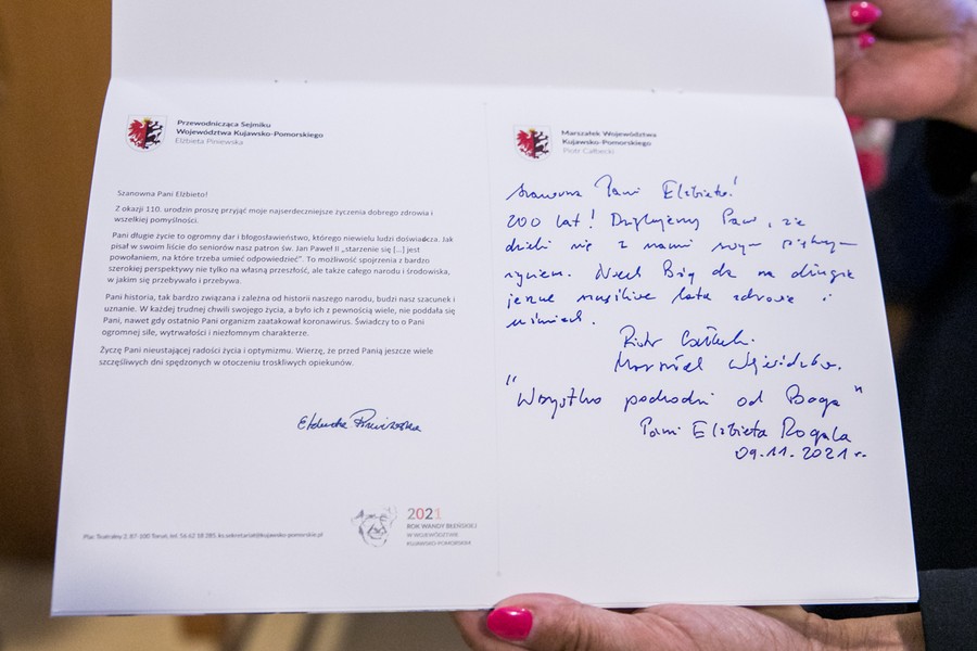 – Za panią Elżbietą ponad wiek polskiej historii. Takie życie to skarbnica wiedzy dla kolejnych pokoleń. W ten piękny jubileusz chciałbym przekazać słowa wdzięczności za owoce minionych stu dziesięciu lat. Mam nadzieję że przekazane życzenia, które napłynęły od mieszkańców regionu i instytucji kultury, umilą ten szczególny dzień – powiedział marszałek Piotr Całbecki.