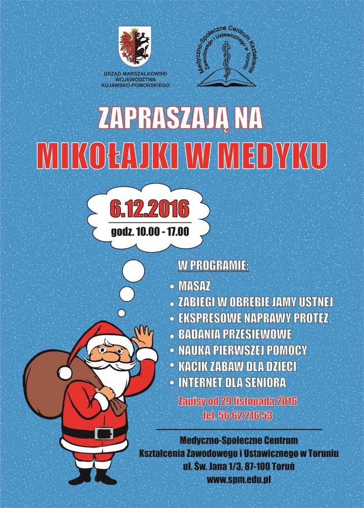 W ramach akcji „Mikołajki w Medyku” Medyczno-Społeczne Centrum Kształcenia Zawodowego i Ustawicznego w Toruniu oraz marszałek Piotr Całbecki zaprosili 6 grudnia na bezpłatne zabiegi i badania w szkolnych gabinetach masażu i urody, zajęcia komputerowe dla seniorów oraz naukę pierwszej pomocy.