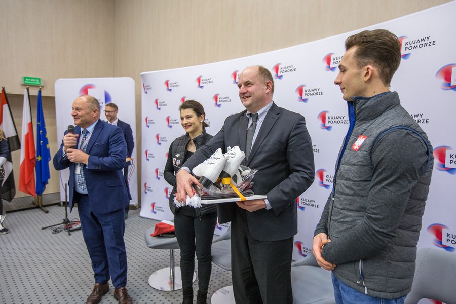 W poniedziałek (29 stycznia) w Urzędzie Marszałkowskim oficjalnie pożegnaliśmy taneczną parę łyżwiarzy z Torunia – Natalię Kaliszek i Maksyma Spodyriewa – którzy będą reprezentować nasz kraj i region na Zimowych Igrzyskach Olimpijskich w Pjongczang. Występy sportowców wspiera samorząd województwa. Będzie to pierwszy wstęp sportowców z regionu na zimowych arenach olimpijskich po 46 latach (w 1972 roku na igrzyskach w Sapporo wystąpił hokeista Ludwik Czachowski z Pomorzanina Toruń).