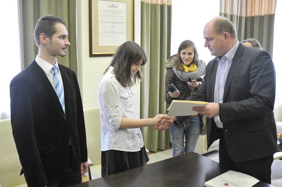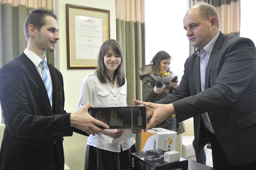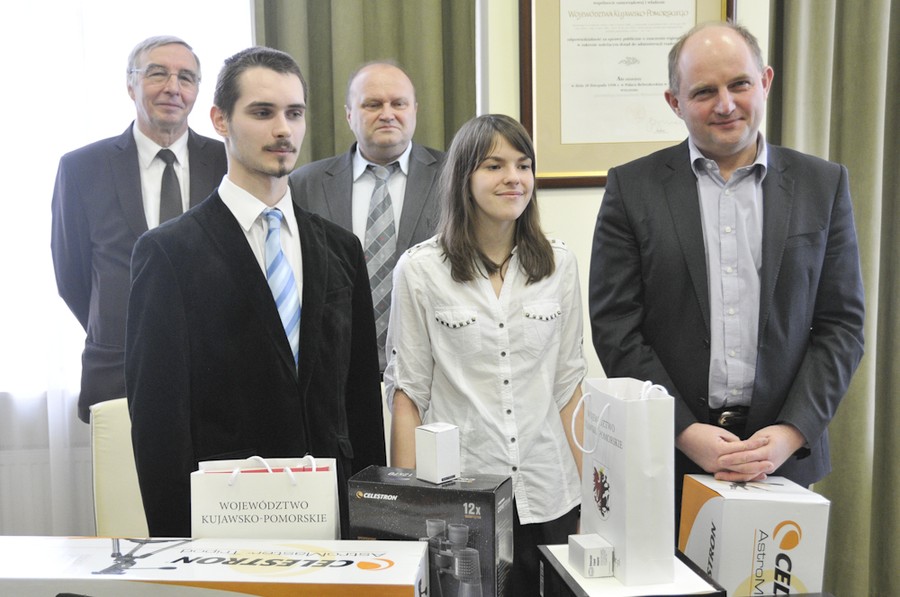 Uczniowie z Kujawsko-Pomorskiego wśród laureatów Ogólnopolskiej Olimpiady Astronomicznej. Paweł Ciuba z Włocławka oraz Zofia Kaczmarek z Torunia zajęli w konkursie drugie miejsce ex aequo. Dzisiaj (12 marca) gratulacje młodym astronomom złożył marszałek Piotr Całbecki. Uczniowie otrzymali też ufundowany przez Urząd Marszałkowski sprzęt astronomiczny: lornetkę „szukacz komet” ze statywem.