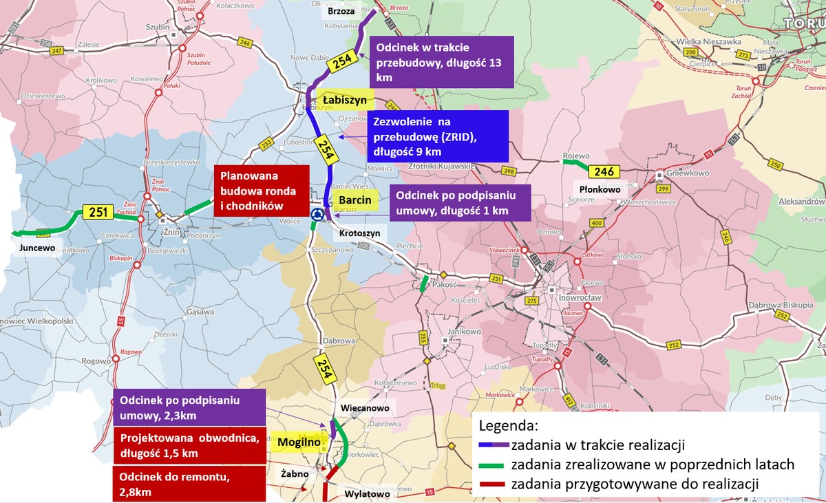 - nr 254 Mogilno-Wiecanowo (powiat mogileński, długość 2,3 km, wartość zadania 2,1 mln zł, podpisana umowa z wykonawcą)