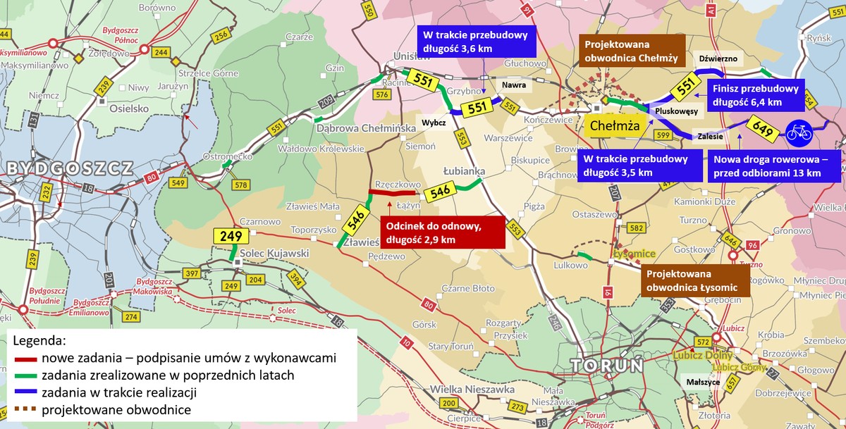 Z początkiem tego roku rozpoczęła się przebudowa 13-kilometrowego odcinka odcinka z Brzozy do Łabiszyna (zrealizowano 40% zakresu rzeczowego). Ta inwestycja pochłonie prawie 46 mln zł. Zobacz: Zaawansowane prace na trasie Brzoza-Łabiszyn