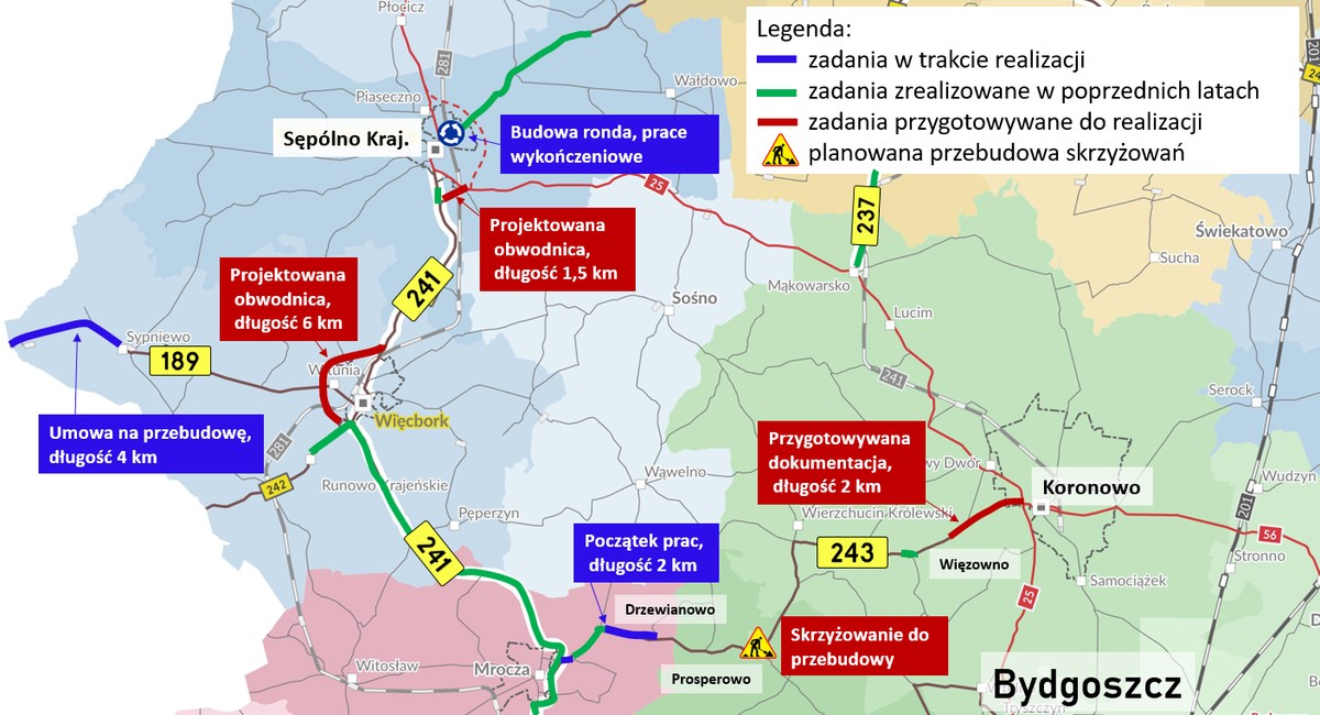 - Sypniewo-granica województwa na drodze wojewódzkiej nr 189 (powiat sępoleński, długość 4,2 km, wartość zadania 9,93 mln zł, wykonawca: Drogomex z Pruszkowa),