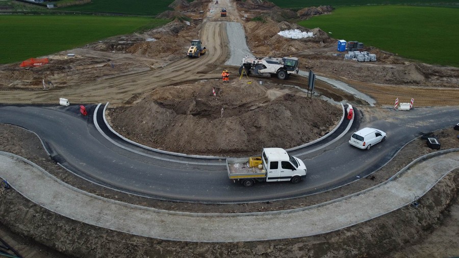 Wykonawca prowadzi kolejne roboty brukarskie związane ze ścieżką pieszo-rowerową, którą zaprojektowano na centralnej części obwodnicy (w rejonie miejscowości Piaski) i krawężników przy skrzyżowaniach z drogami lokalnymi.