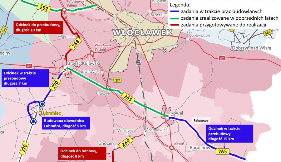 Równocześnie trwają przygotowania do uruchomienia kolejnych zadań drogowych w powiecie włocławskim. W poniedziałek (24 kwietnia) ogłoszony został przetarg na przebudowę 5,5-kilometrowego odcinka drogi wojewódzkiej nr 268 pomiędzy Chodczem i Wolą Adamową. Przebudowa drugiego odcinka na tej trasie z Woli Adamowej do Chocenia o długości 2,9 km zostanie zlecona w przyszłym roku. Powstaje dokumentacja niezbędna do zlecenia prac przy przebudowie drogi nr 268 od Brzezia do Brześcia o długości 10 kilometrów. Na te zadania samorząd województwa zdobył środki z funduszy zewnętrznych. Zaawansowane prace trwają przy rozbudowie kolejnego odcinka drogi wojewódzkiej nr 265 z Kowala do Baruchowa.