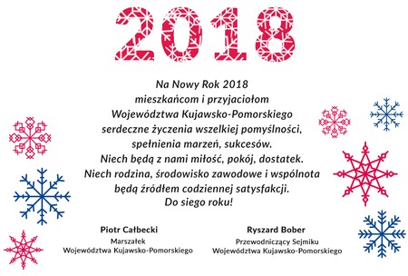 Na Nowy Rok 2018 mieszkańcom i przyjaciołom Województwa Kujawsko-Pomorskiego serdeczne życzenia wszelkiej pomyślności, spełnienia marzeń, sukcesów.