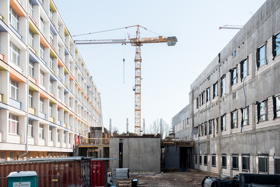 Funkcjonuje już wielopoziomowy parking na 423 samochody. Gotowe są także budynki techniczne, w których mieszczą się między innymi garaż dla ambulansów, kotłownia, stacja mycia łóżek i stacja transformatorowa. Bardzo zaawansowane są prace w nowej siedzibie administracji lecznicy, która zgodnie z planem ma być gotowa jeszcze w tym roku. W części tego budynku są już ścianki działowe i trwają roboty przy instalacjach. W gmachu głównym ekipy budowlane montują ścianki gipsowo-kartonowe, trwają także roboty tynkarskie i murarskie oraz instalacyjne. Rośnie pawilon dla oddziału zakaźnego, rozpoczęła się też budowa pawilonu dla oddziałów psychiatrycznych.