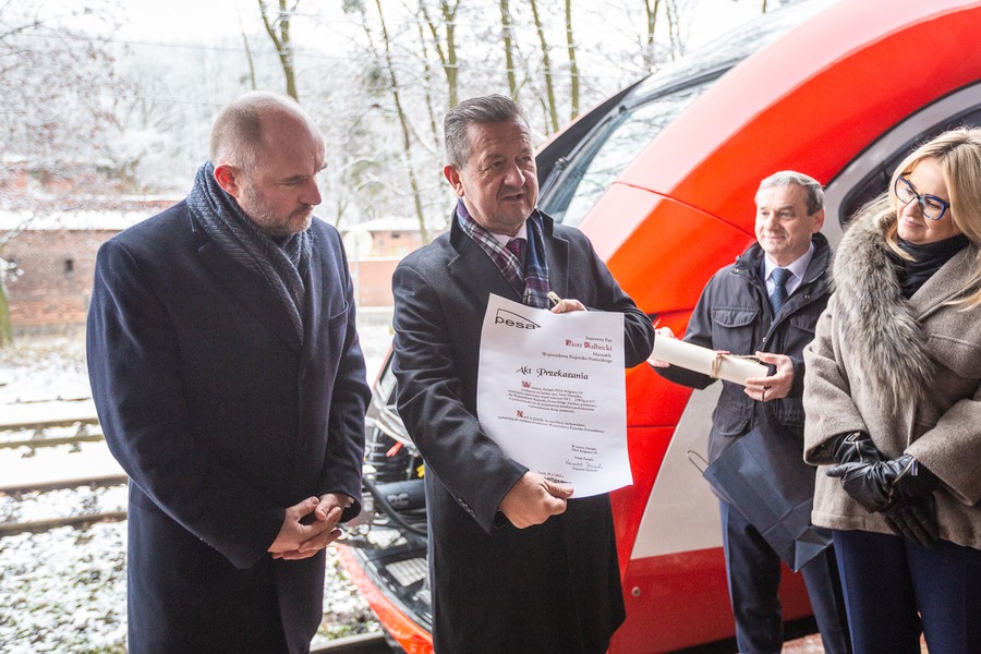 Zakupione przez samorząd województwa w bydgoskiej Pesie nowe elektryczne zespoły trakcyjne, z klimatyzacją i 150 miejscami siedzącymi każdy, od piątku (25 listopada) na torach w naszym regionie. W przejeździe inauguracyjnym na trasie Toruń – Jabłonowo Pomorskie uczestniczyli marszałek Piotr Całbecki, wicemarszałek Zbigniew Sosnowski i członek zarządu województwa Aneta Jędrzejewska. Wkrótce przygotowania do wymiany pociągów spalinowych na zasilane energią wodorową.