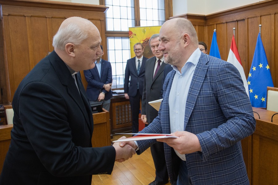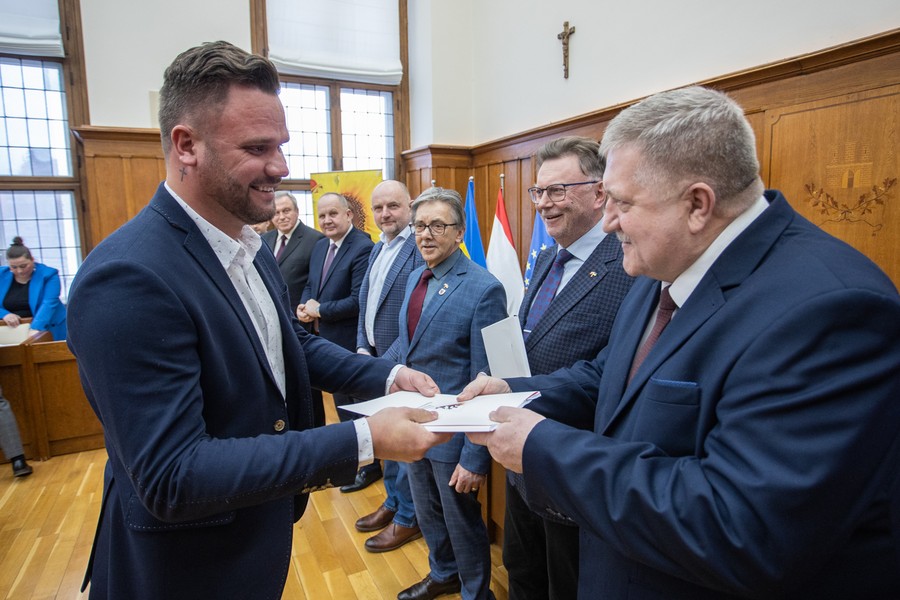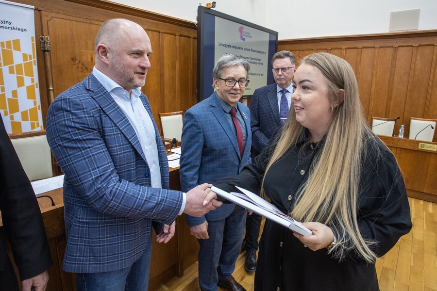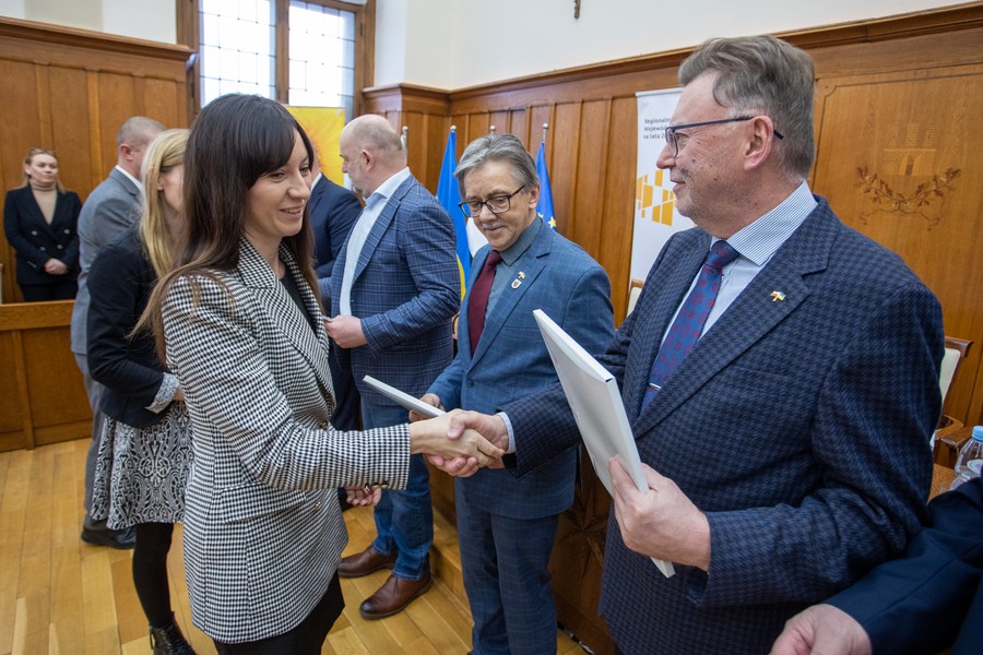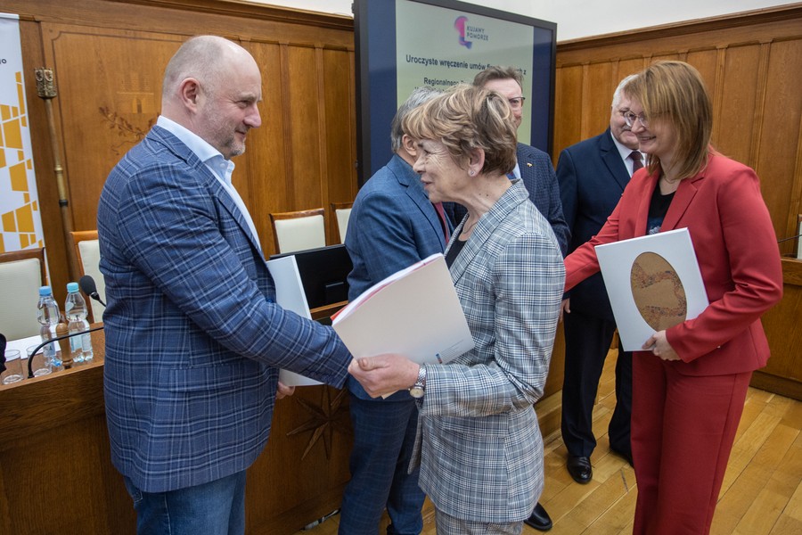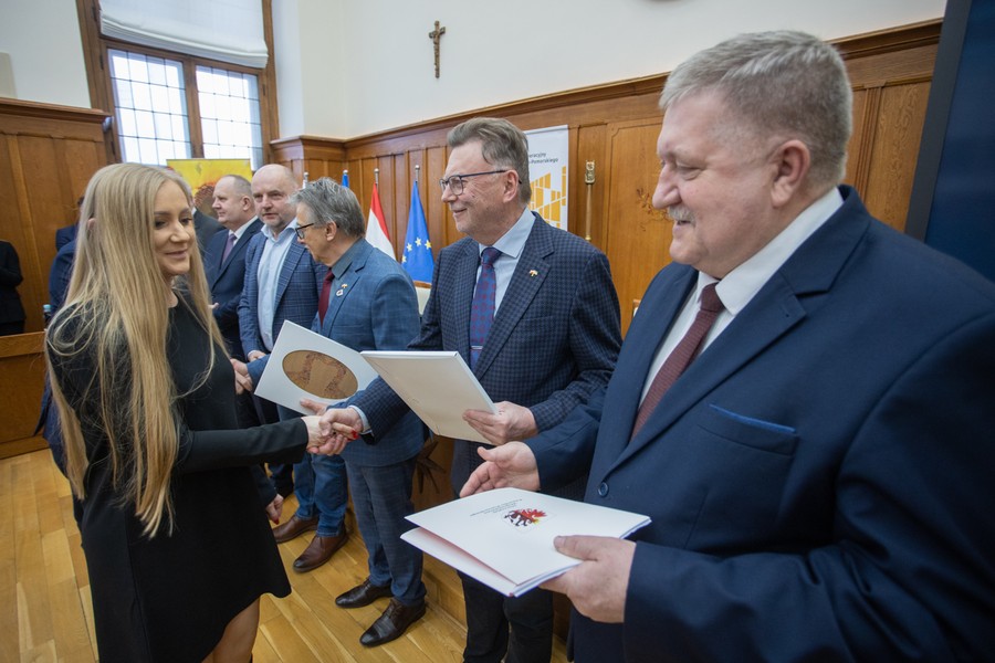 Marszałek Piotr Całbecki spotkał się we wtorek (21 lutego) z beneficjentami naszego Regionalnego Programu Operacyjnego (RPO) 2014-2020 i pozostającej w dyspozycji Urzędu Marszałkowskiego puli środków Programu Rozwoju Obszarów Wiejskich (PROW) kończącej się unijnej siedmiolatki. W ceremonii wręczenia umów o dofinasowanie projektów uczestniczyli też wicemarszałek Zbigniew Ostrowski, wicemarszałek Zbigniew Sosnowski i członek zarządu województwa Sławomir Kopyść oraz radni województwa Stanisław Pawlak i Tadeusz Pogoda. Łączna wartość przypieczętowanego dzisiaj wsparcia to ponad 5 milionów złotych. Zdjęcia do pobrania