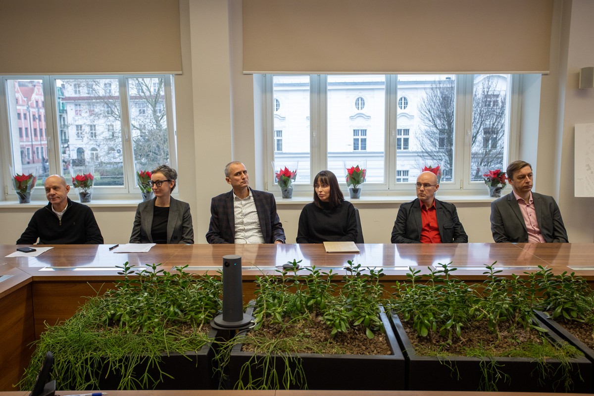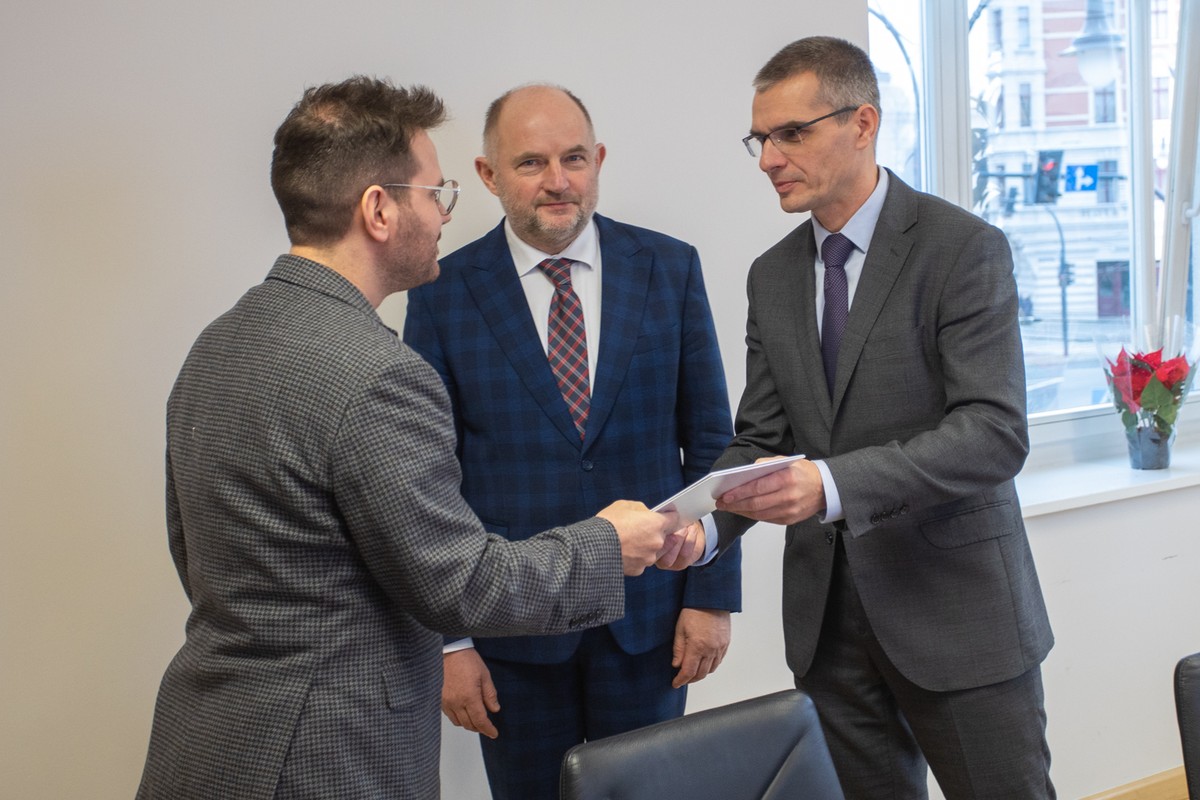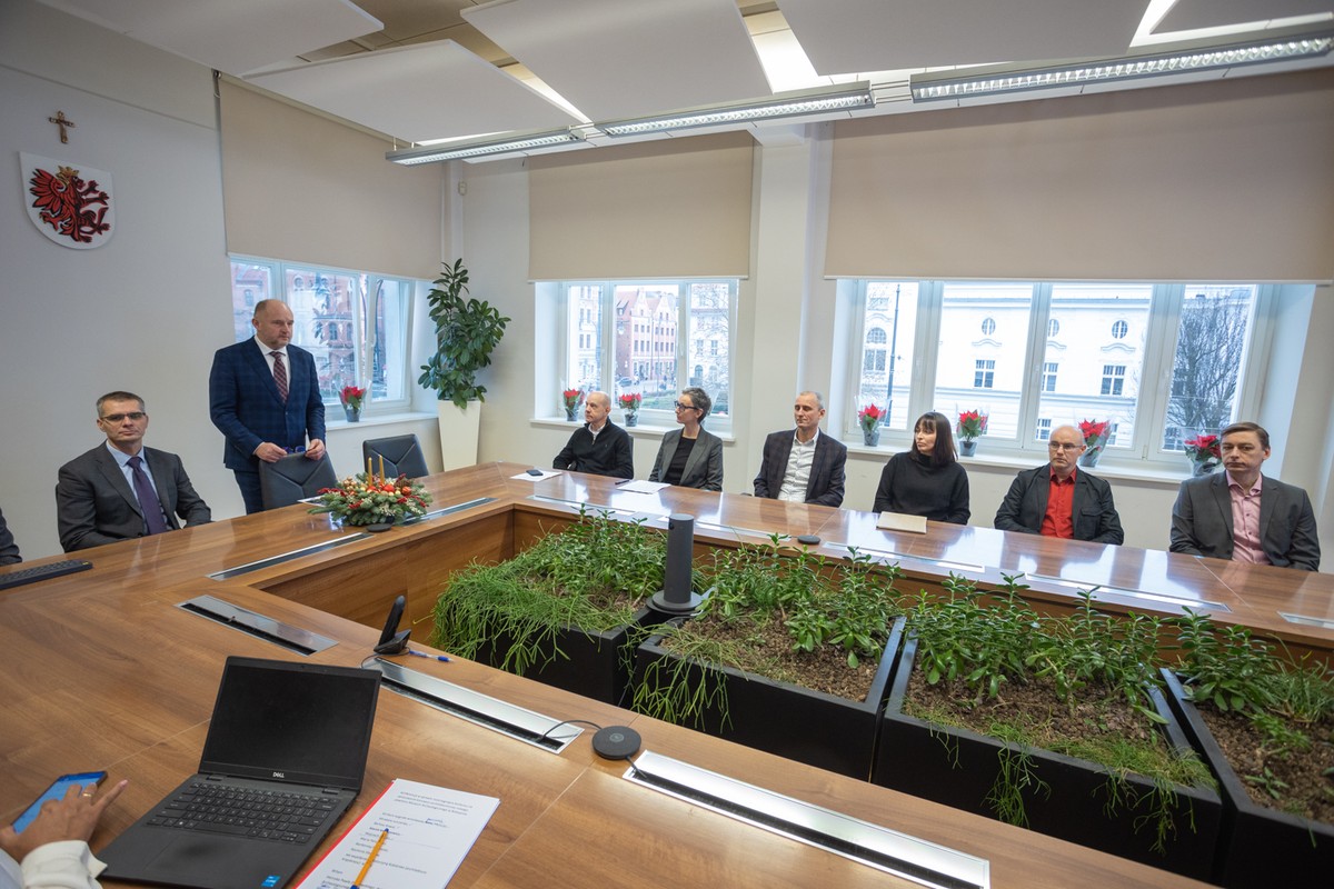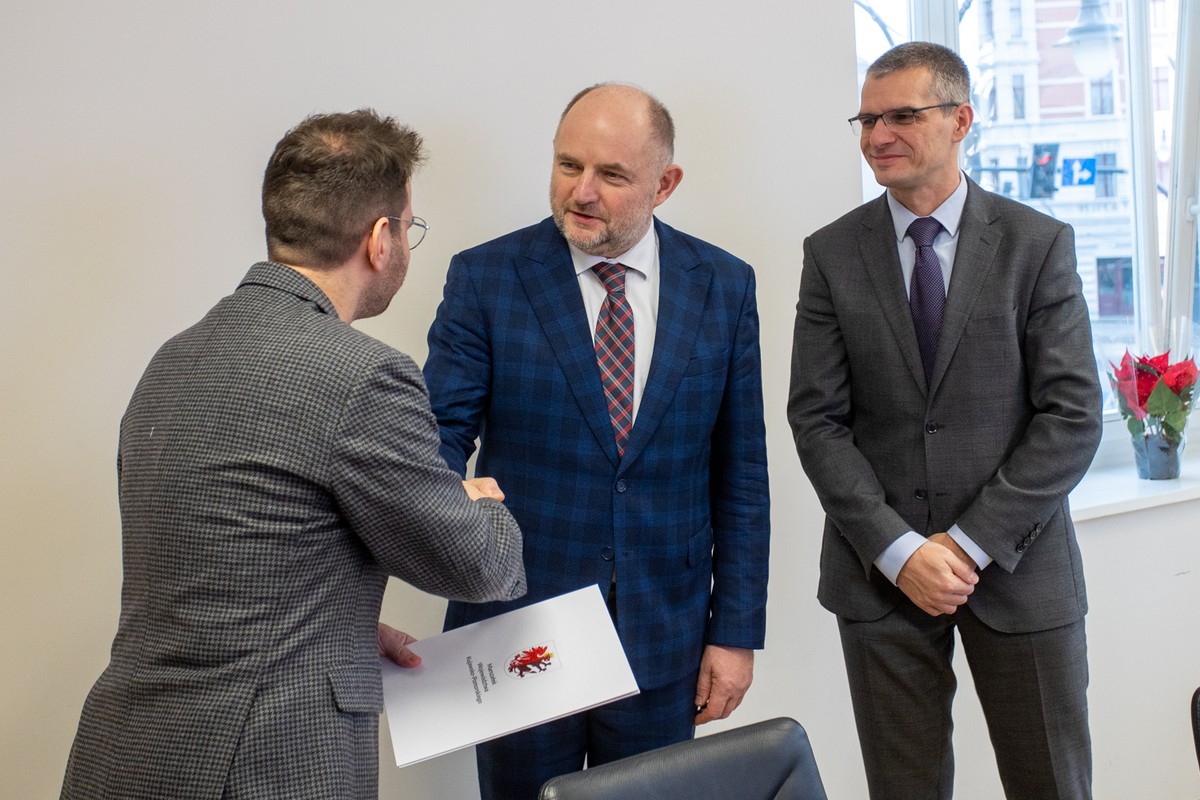 - Marszałek Piotr Całbecki gratulował autorom zwycięskiej koncepcji na pawilon muzealny w Biskupinie fot. Mikołaj Kuras dla UMWKP