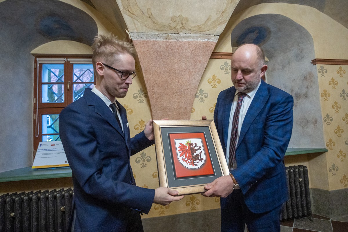 Marszałek Piotr Całbecki i radna województwa Katarzyna Lubańska uczestniczyli w piątek (15 grudnia) w otwarciu odrestaurowanej dzięki marszałkowskiemu programowi ochrony zabytków sali ślubów (dawnej sali sądowej) w XVI-wiecznym chełmińskim ratuszu staromiejskim, który jest jednym z najcenniejszych zabytków województwa kujawsko-pomorskiego.