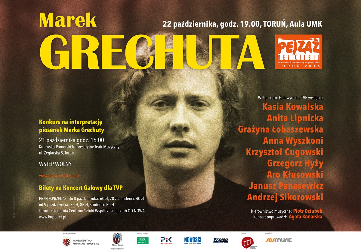 Utwory Marka Grechuty zabrzmią podczas kolejnej edycji festiwalu „Pejzaż bez Ciebie”, imprezy przypominającej dorobek wybitnych polskich artystów, którzy już odeszli. W środę (21 października) w siedzibie Teatru Muzycznego w Toruniu odbył się konkurs dla młodych wykonawców na interpretację piosenki mistrza poezji śpiewanej, punktem kulminacyjnym wydarzenia był wczorajszy (22 października) koncert galowy z udziałem gwiazd polskiej sceny muzycznej w auli Uniwersytetu Mikołaja Kopernika, w którym uczestniczył marszałek Piotr Całbecki. Współorganizatorem imprezy jest Urząd Marszałkowski.