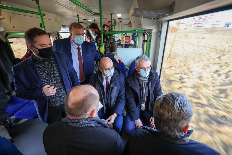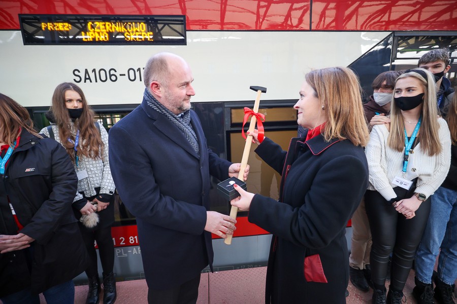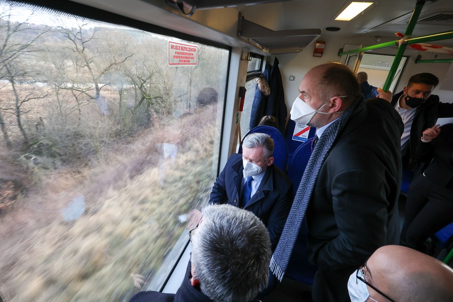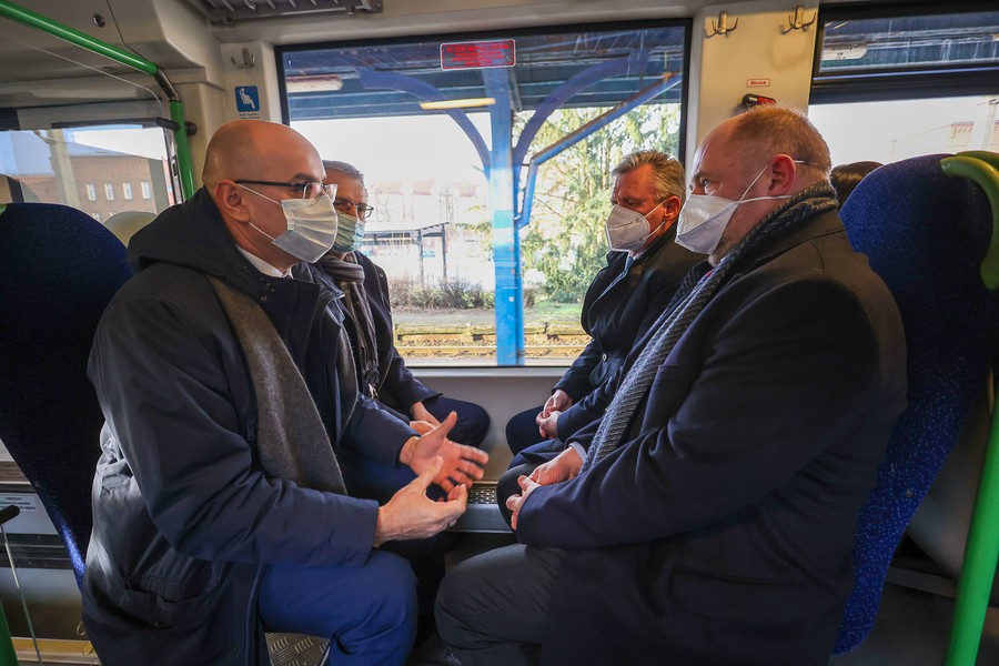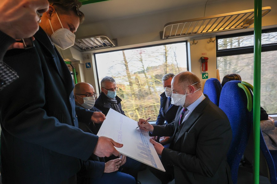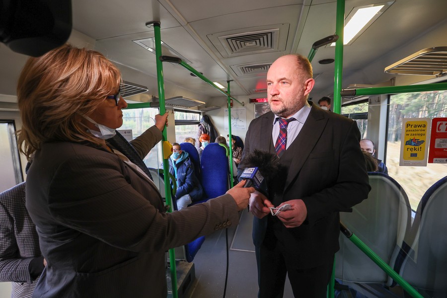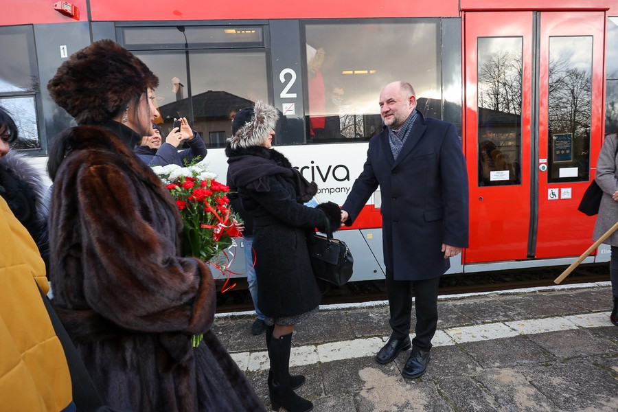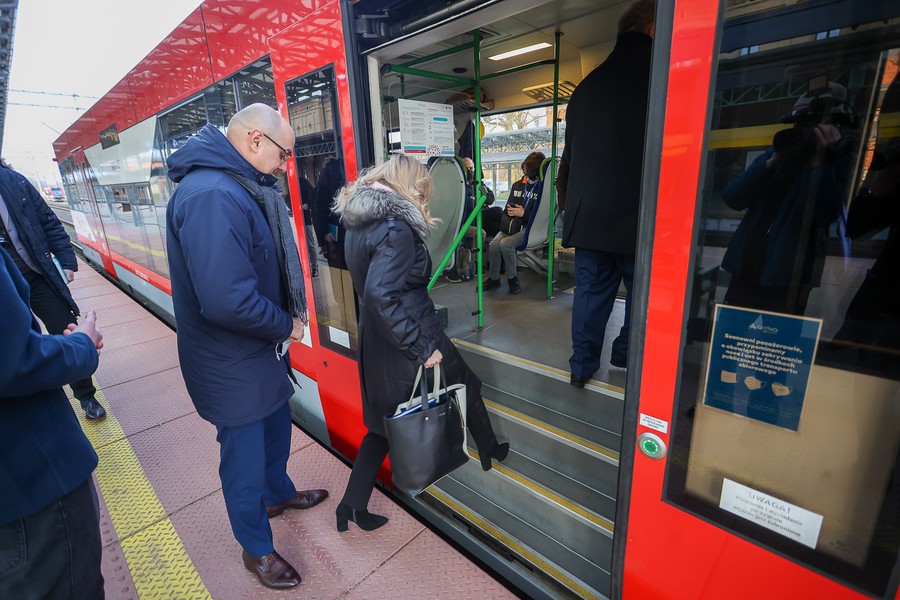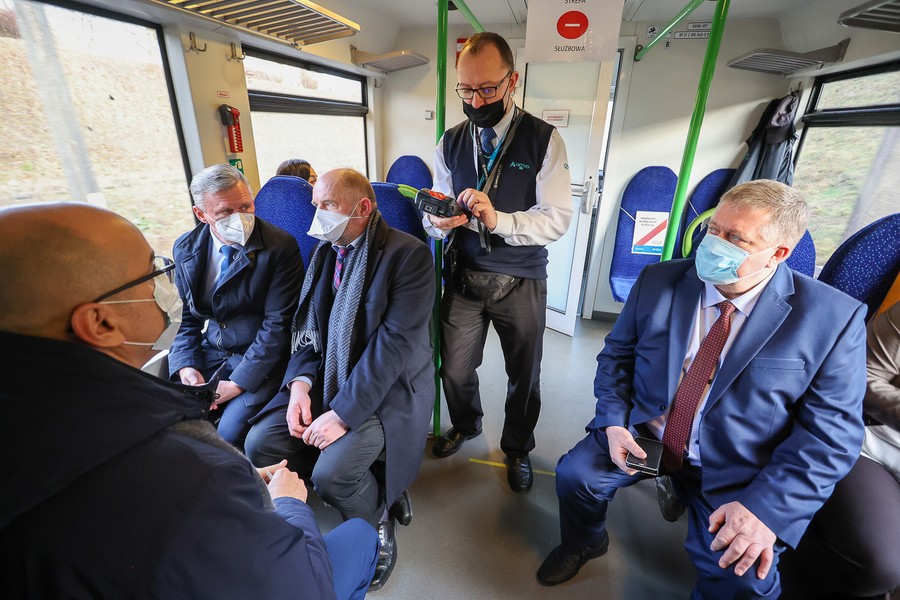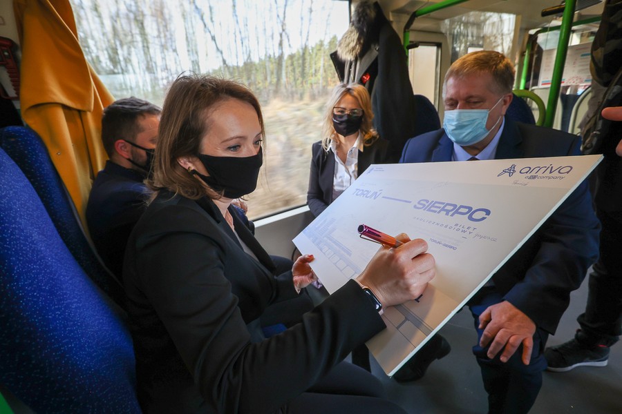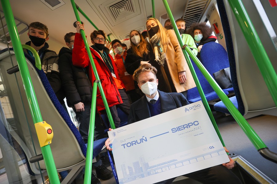 Na pokładzie składu należącego do Arrivy, która jest jednym z dwóch operatorów obsługujących regionalne pasażerskie przewozy kolejowe w Kujawsko-Pomorskiem, z Torunia do Lipna oprócz gospodarza województwa przejechali też członkowie zarządu województwa Aneta Jędrzejewska i Sławomir Kopyść, wójt gminy Czernikowo Tomasz Krasicki, wójt gminy Obrowo Andrzej Wieczyński, wójt gminy Lubicz Marek Nicewicz oraz wiceprezes Arrivy Dominika Żelazek, a także młodzież z Technikum Kolejowego w Bydgoszczy pod opieką dyrektor Mirosławy Pawlak-Szablewskiej i kierownika praktyk zawodowych Wioletty Bargiel. Na dworcu w Lipnie powitał ich starosta lipnowski Krzysztof Baranowski.