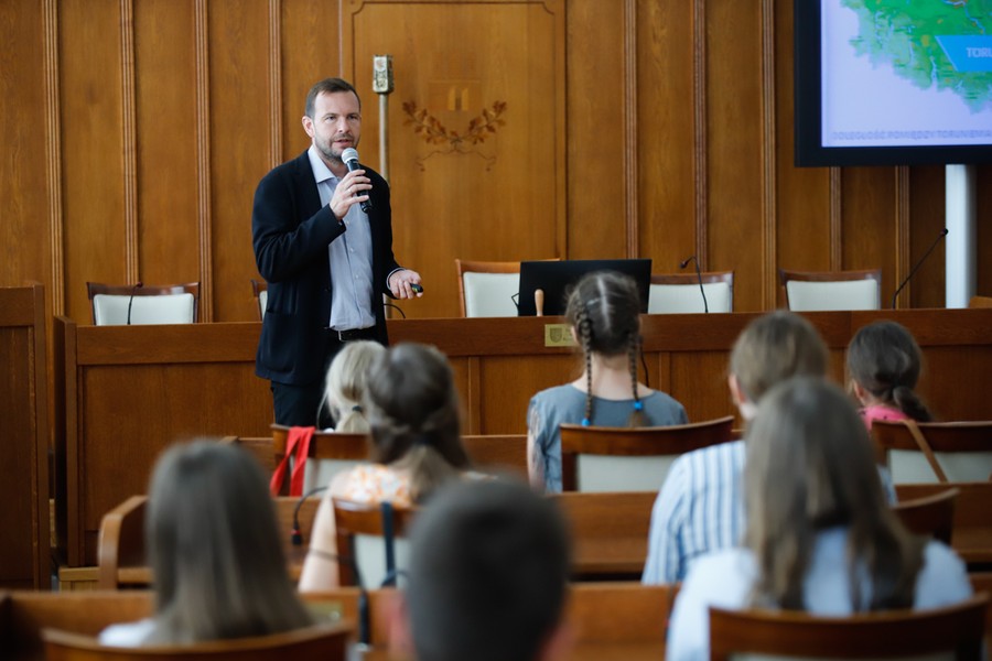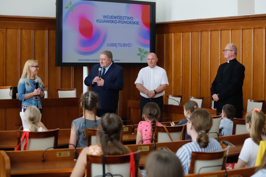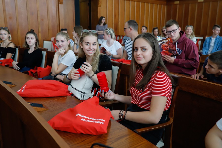 Blisko stuosobowa grupa dzieci i młodzieży z Litwy, Ukrainy i Stanów Zjednoczonych gościła w piątek (12 lipca) w Urzędzie Marszałkowskim. Z młodymi Polakami mieszkającymi poza granicami kraju spotkał się członek zarządu województwa Sławomir Kopyść. Nasi goście wysłuchali prezentacji o walorach kulturowych i krajoznawczych Kujaw i Pomorza oraz otrzymali upominki.