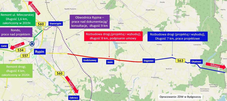 Samorząd województwa pozyskał na budowę obwodnicy środki centralne z Rządowego Funduszu Rozwoju Dróg w wysokości 60 mln zł. Inwestycja o wartości 100 mln zł realizowana jest w partnerstwie z miastem Rypin, gminą Rypin i powiatem rypińskim. Cała obwodnica o długości prawie 9 kilometrów zbudowana zostanie w parametrach drogi klasy G – jezdnia będzie miała szerokość 7 metrów, powstaną szerokie pobocza oraz nowe skrzyżowania, a ich rodzaj określi przygotowywana koncepcja. Dzięki współpracy z samorządem lokalnym powstaje też dokumentacja projektowa niezbędna do budowy ronda na połączeniu drogi wojewódzkiej nr 534 (w kierunku Golubia-Dobrzynia) i ulicy Mleczarskiej. Zmodernizowana ulica wraz z nowym rondem będzie częścią trasy wyprowadzającej tranzyt z centrum Rypina.