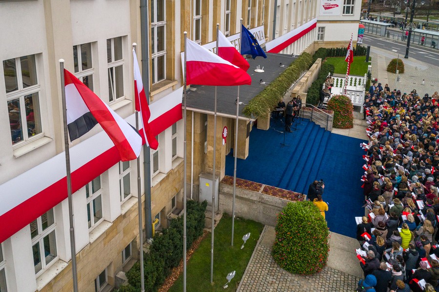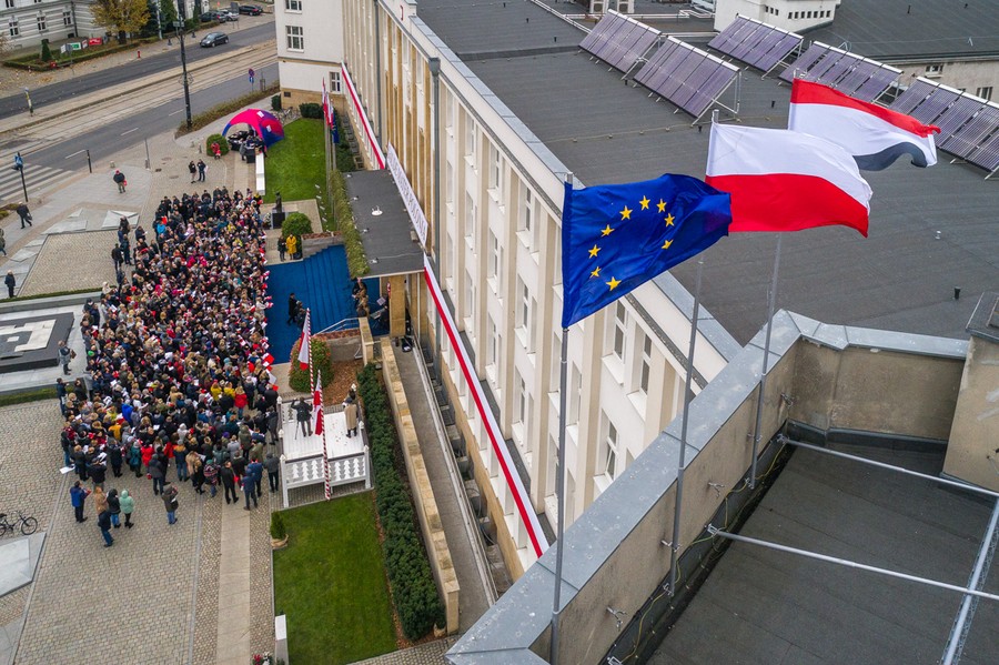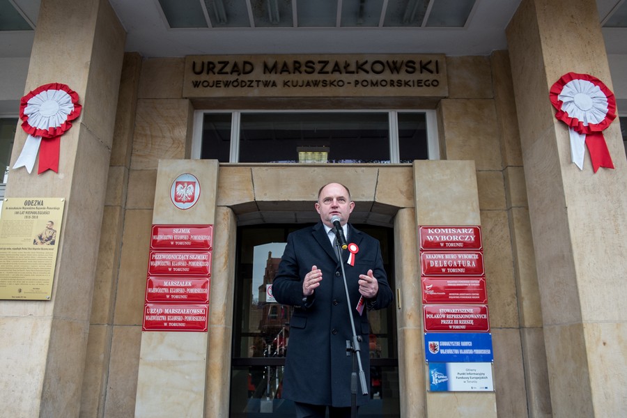 W roku stulecia odzyskania przez Polskę niepodległości na placu przed udekorowanym budynkiem Urzędu Marszałkowskiego zorganizowaliśmy szereg wydarzeń. W grudniu ubiegłego roku na frontonie gmachu urzędu umieszczono tablicę z apelem o wspólne świętowanie jubileuszu. W maju odbyła się uroczysta sesja sejmiku województwa połączona z Forum Samorządowym. 11 listopada odsłoniliśmy tablicę upamiętniającą obchody 100-lecia odzyskania niepodległości, na której wyryta została treść deklaracji mieszkańców województwa na stulecie niepodległości. Więcej o tych wydarzeniach w tekście „Rok dla Niepodległej”.