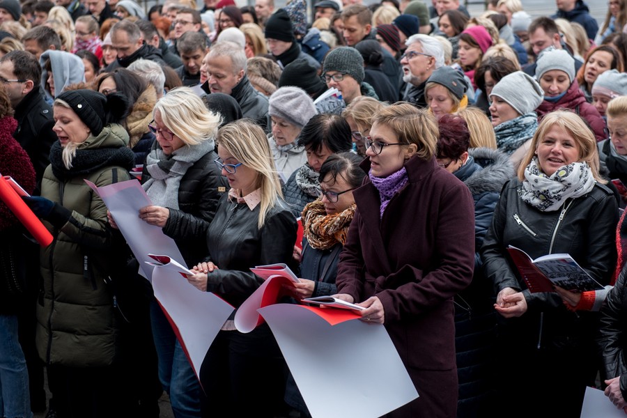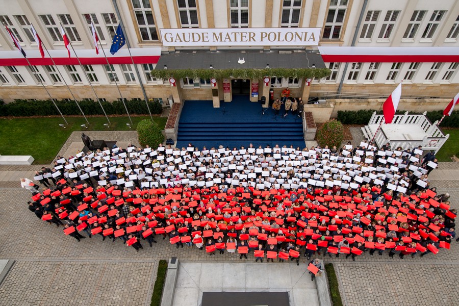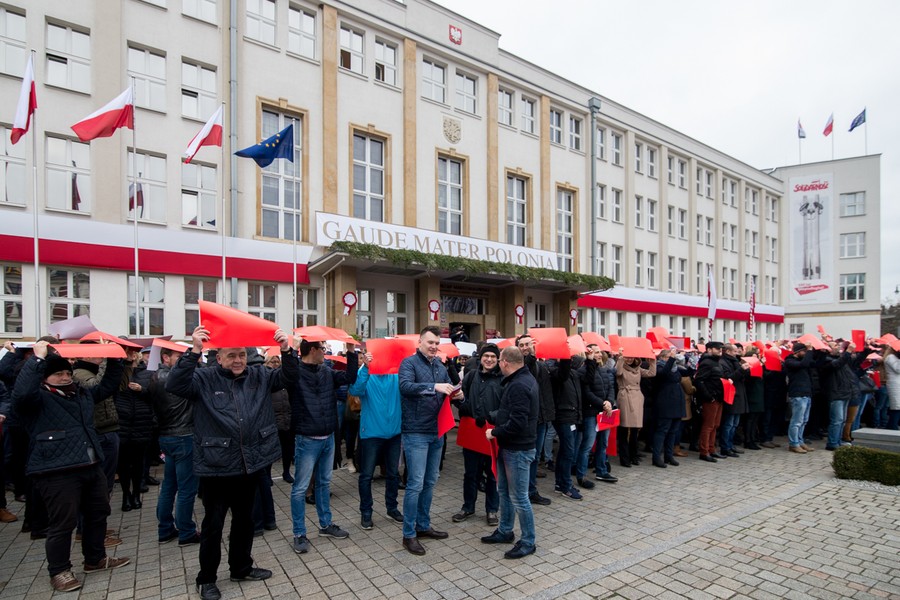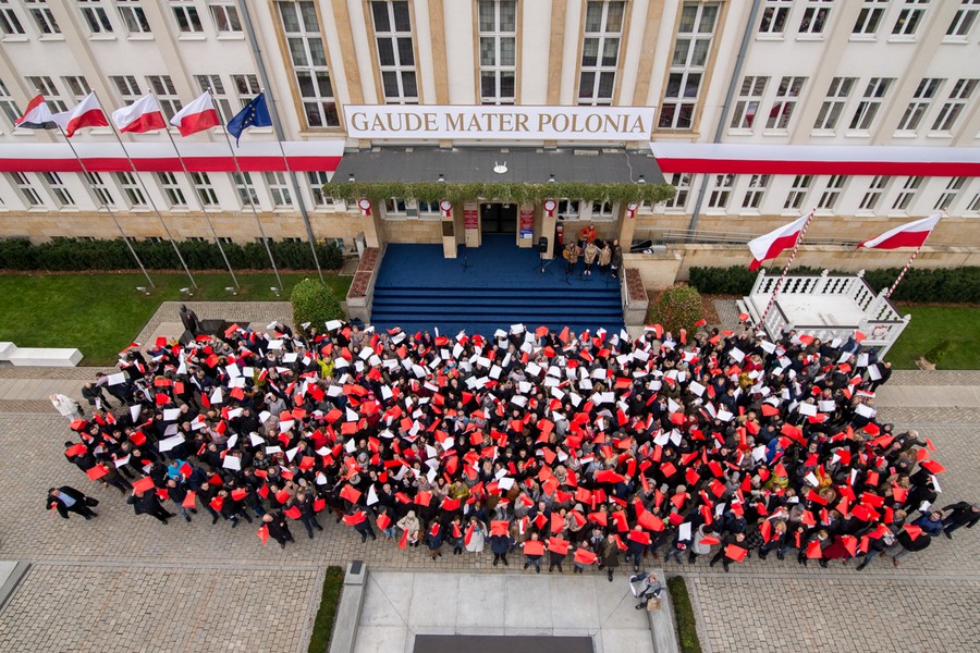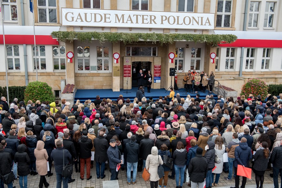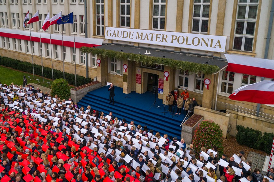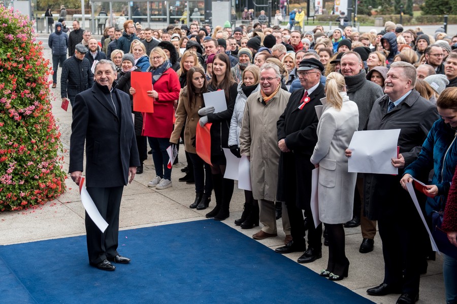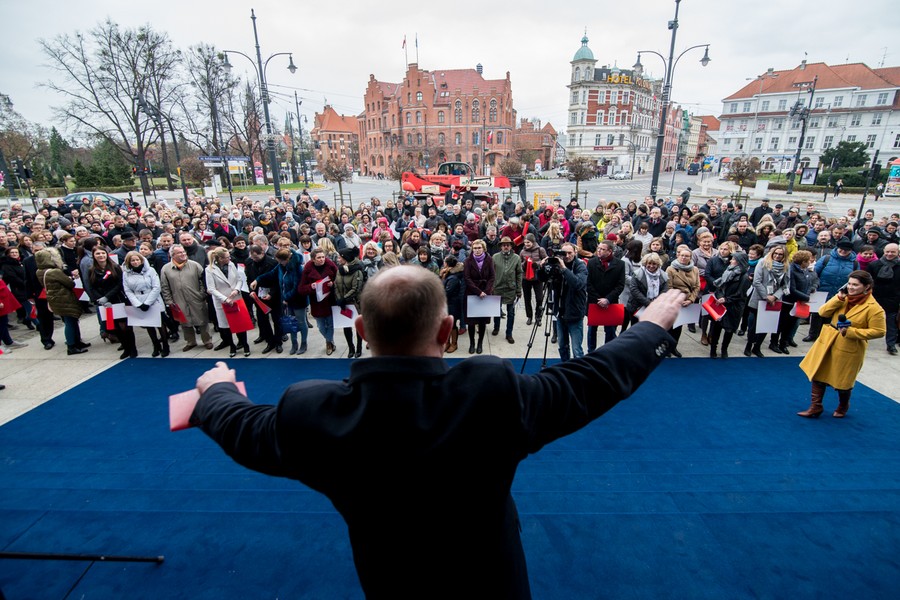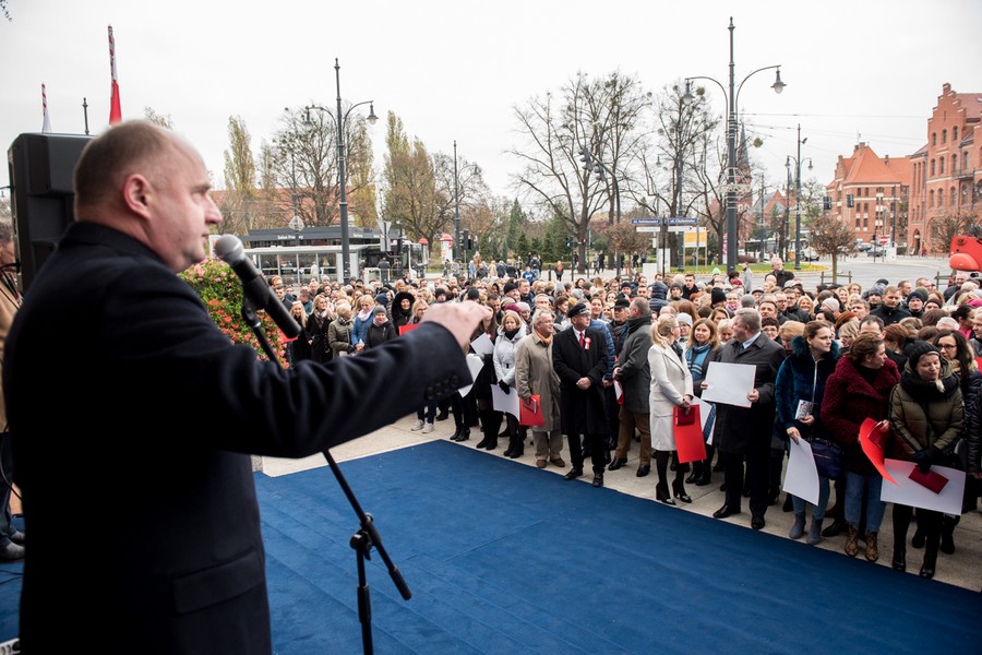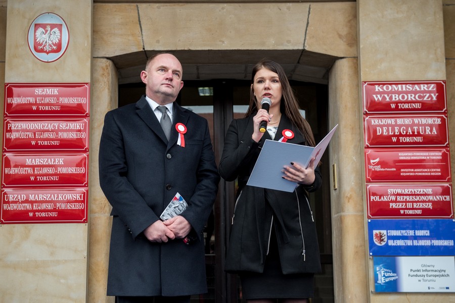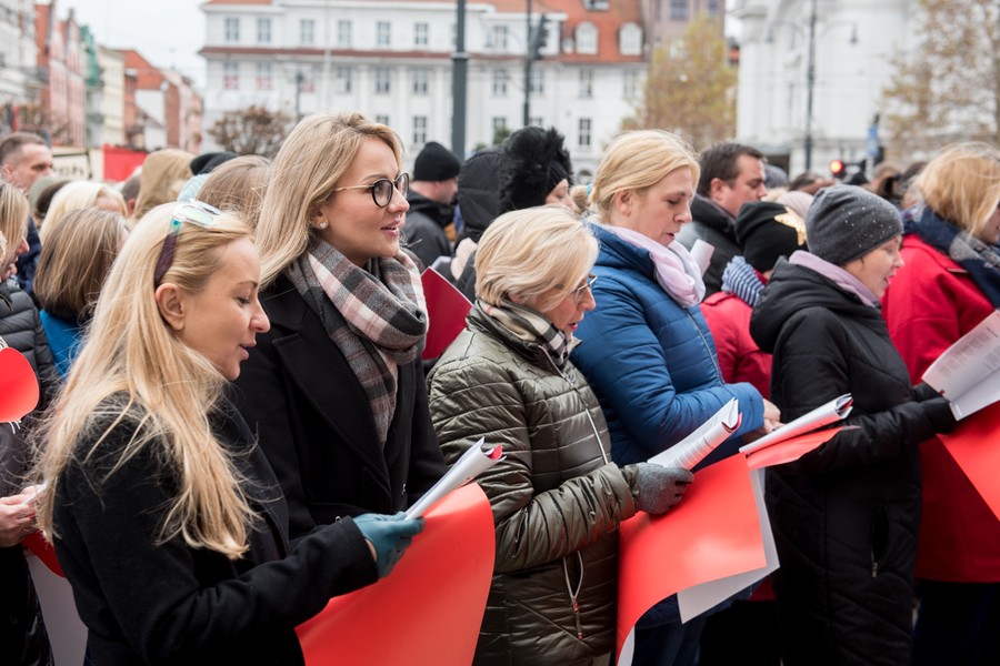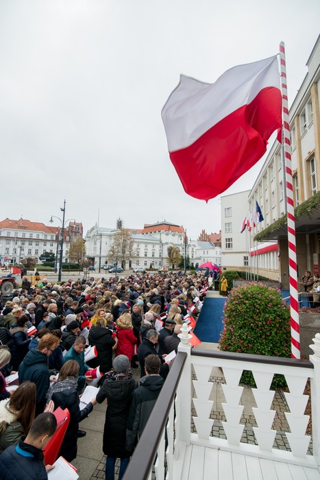Kolejnym akcentem obchodów stulecia odzyskania przez Polskę niepodległości było piątkowe (16 listopada) spotkanie pracowników Urzędu Marszałkowskiego na placu Teatralnym w Toruniu, podczas którego wspólnie śpiewaliśmy pieśni patriotyczne, a także wykonaliśmy zdjęcie w biało-czerwonych barwach.