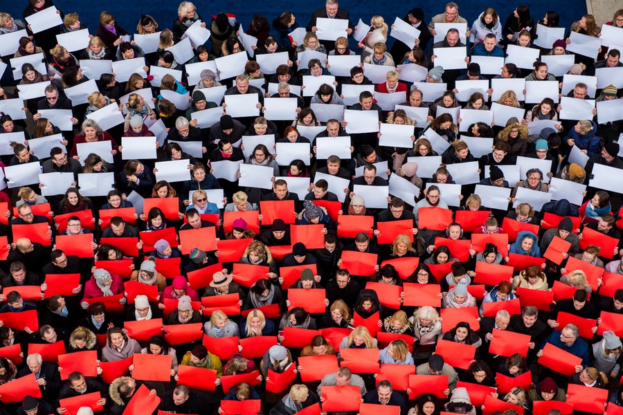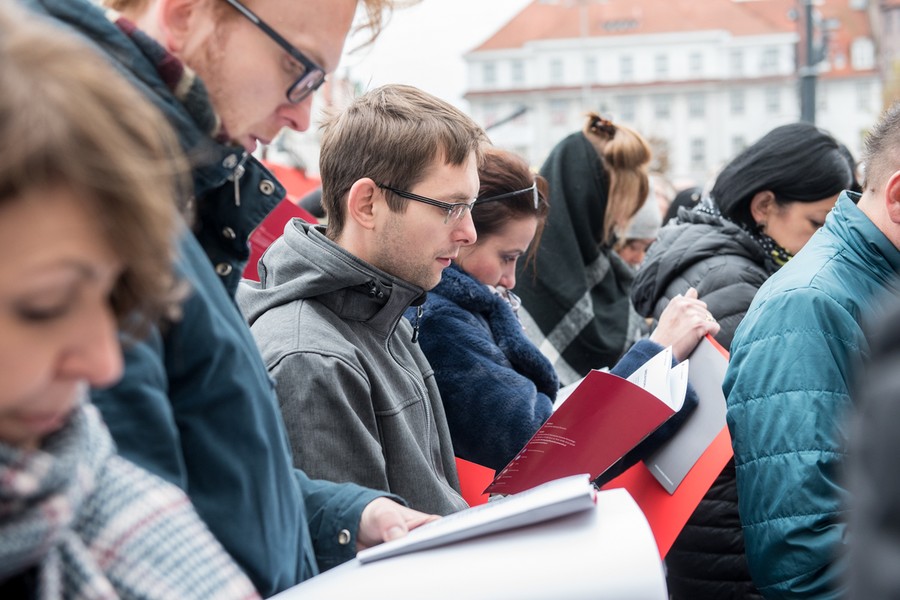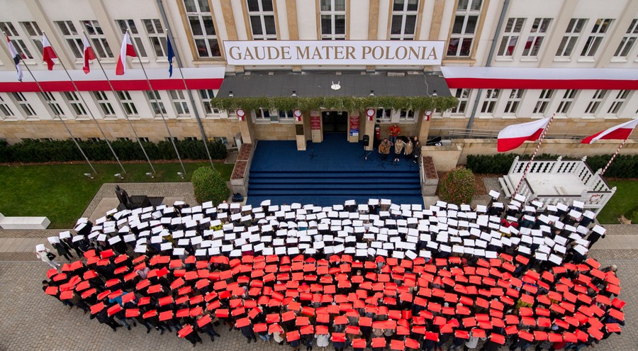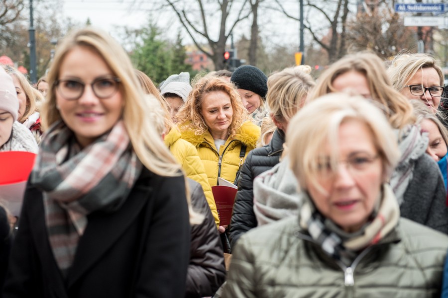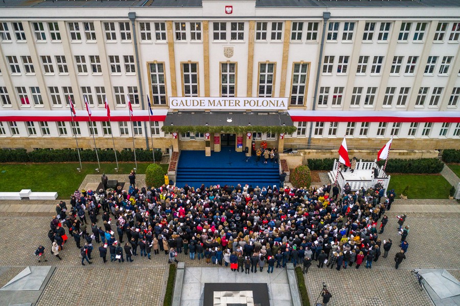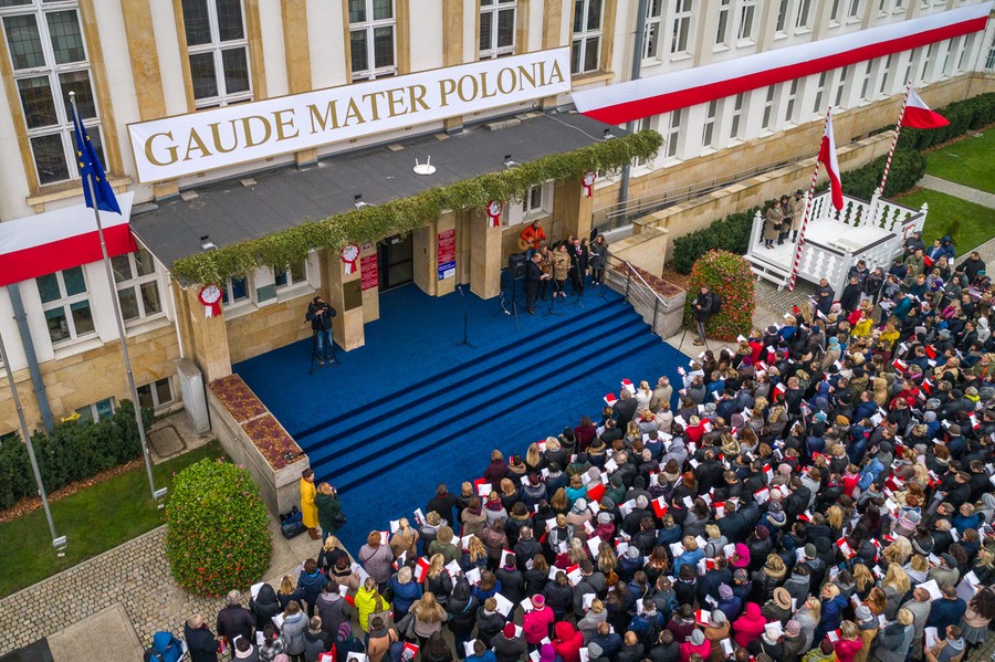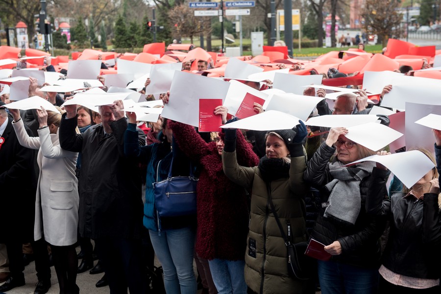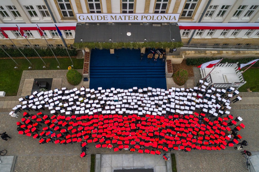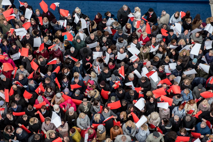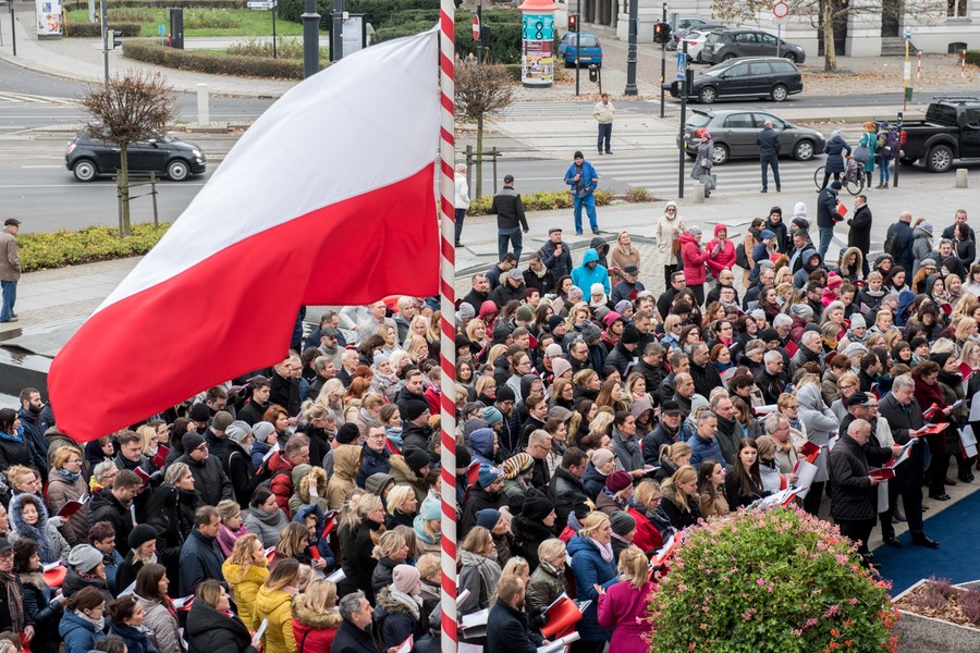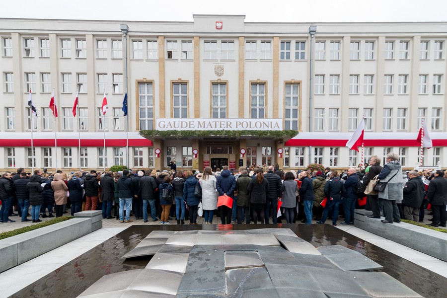 Kolejnym akcentem obchodów stulecia odzyskania przez Polskę niepodległości było piątkowe (16 listopada) spotkanie pracowników Urzędu Marszałkowskiego na placu Teatralnym w Toruniu, podczas którego wspólnie śpiewaliśmy pieśni patriotyczne, a także wykonaliśmy zdjęcie w biało-czerwonych barwach.