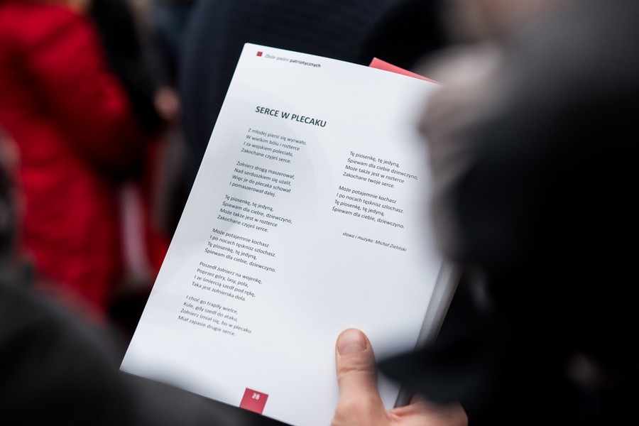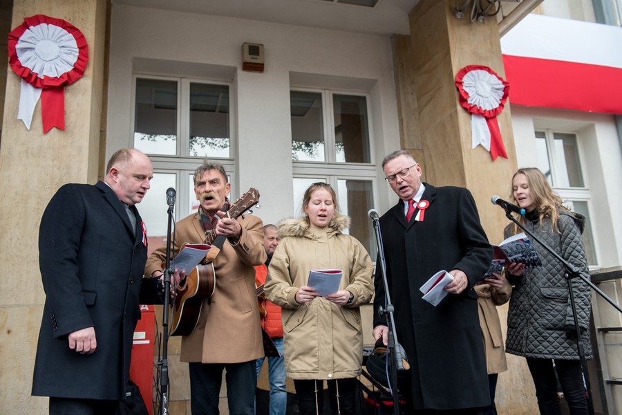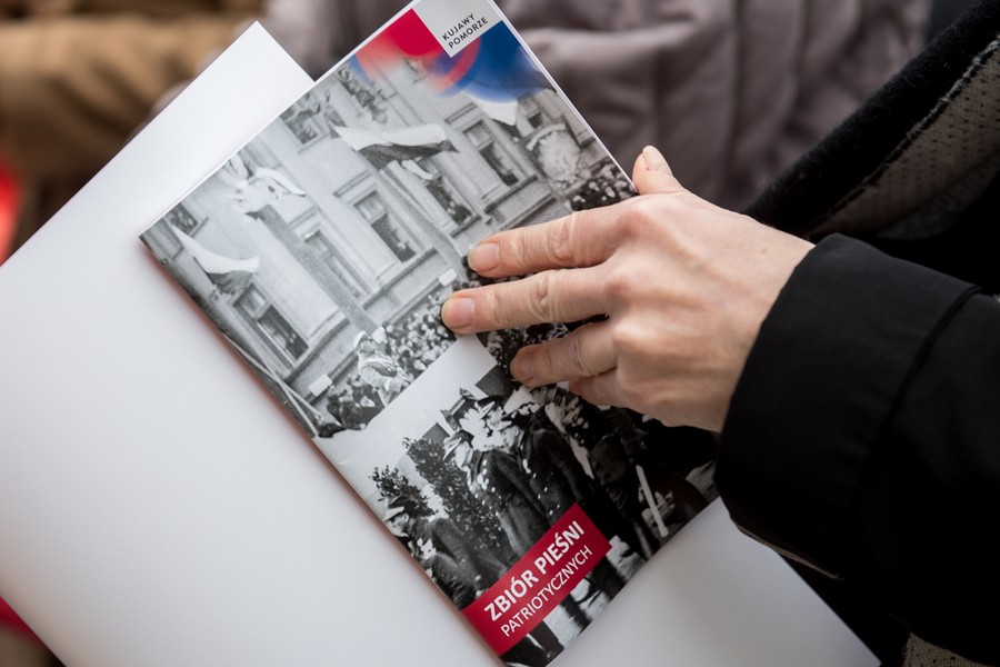 Pracownicy marszałkowskiej administracji zaśpiewali między innymi: „Serce w plecaku”, „Przybyli ułani pod okienko”, „My, Pierwsza Brygada”, „Wojenko, wojenko”, „Hej, hej ułani”, „Jak długo na Wawelu”, „Szara piechota”, „Czerwone maki na Monte Cassino” i hymn narodowy. Odczytano także „Deklarację mieszkańców województwa kujawsko-pomorskiego w 100. rocznicę odzyskania przez Polskę niepodległości”. Uroczystość zakończyła się ułożeniem wielkiej flagi z białych i czerwonych kartoników i wspólnym zdjęciem.