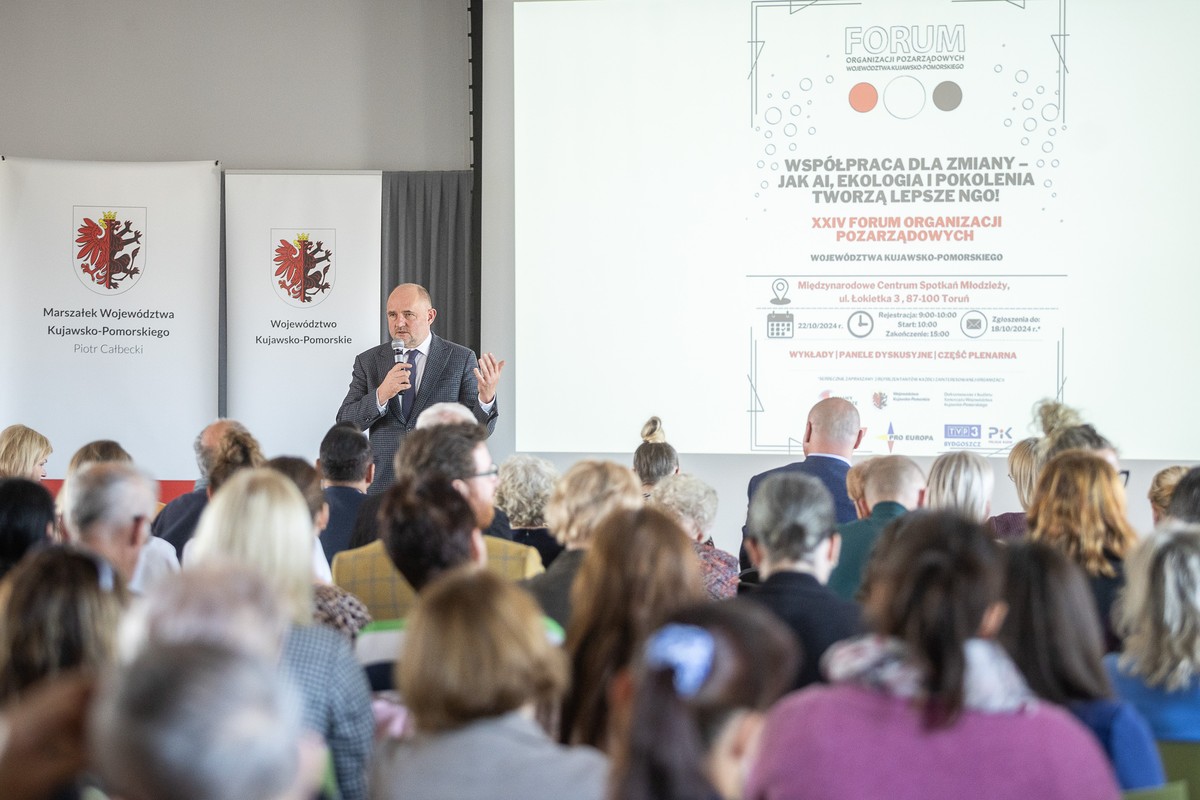 Marszałek Piotr Całbecki i radna województwa Anna Niewiadomska byli we wtorek (22 października) gośćmi obradującego w Toruniu XXIV Forum Organizacji Pozarządowych Województwa Kujawsko-Pomorskiego. Gospodarz województwa w swoim wystąpieniu podziękował przedstawicielom instytucji trzeciego sektora za zaangażowanie i wrażliwość na drugiego człowieka.