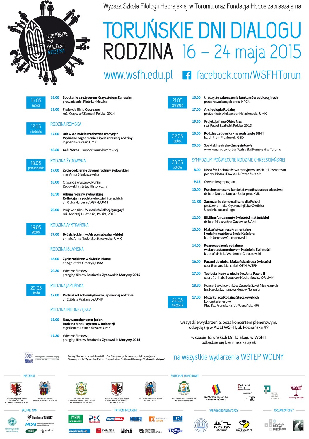Świętujemy Rok Jana Pawła II – Papieża Rodziny. Najważniejszą majową imprezą obchodów są rozpoczynające się w najbliższą sobotę (16 maja) interdyscyplinarne Toruńskie Dni Dialogu w Wyższa Szkoła Filologii Hebrajskiej. Organizatorzy zapraszają na dziewięć popołudni i wieczorów międzykulturowych spotkań z interesującym kinem, muzyką i myślą społeczną. W programie także prezentacja interesującej wystawy, spektakl teatralny oraz sympozjum poświęcone rodzinie. Wśród mecenasów wydarzenia jest samorząd województwa. Wstęp wolny.