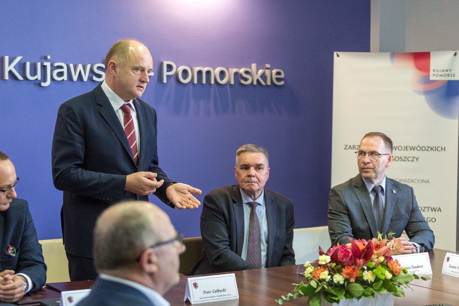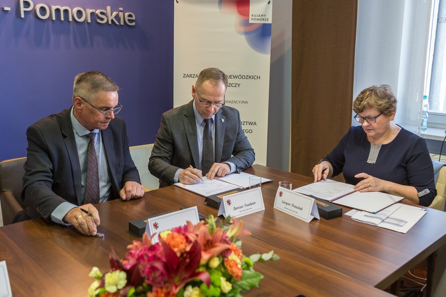 29 kwietnia w Urzędzie Marszałkowskim odbyło się uroczyste przekazanie umowy na wykonanie ronda turbinowego w Białych Błotach. Inwestycja poprawi bezpieczeństwo na ruchliwej drodze wojewódzkiej z Bydgoszczy w kierunku trasy ekspresowej S5. Za prace budowlane o wartości 18,6 mln zł odpowiadać będzie firma Kobylarnia SA Samorząd województwa reprezentował marszałek Piotr Całbecki.