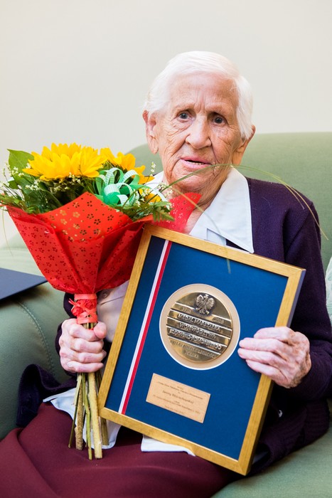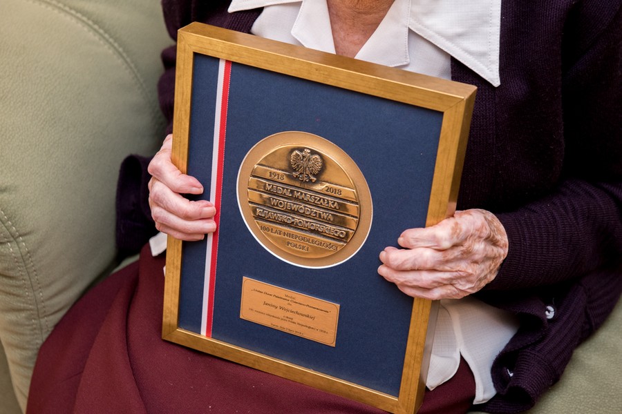 Janina Wojciechowska z domu Kaczor urodziła się 13 maja 1918 roku w miejscowości Woitzel na terenie Niemiec, gdzie jej rodzice wyemigrowali w poszukiwaniu pracy. Obecnie jest to wieś sołecka Wysiedle w województwie zachodniopomorskim. W 1932 roku wrócili do Polski. Na początku II wojny światowej pani Janina została wywieziona na roboty do Niemiec. Po wojnie wyszła za mąż za Walentego Wojciechowskiego, z którym przeprowadzili się do Pakości. Wychowała 4 dzieci, doczekała się 9 wnuków, 15 prawnuków i 1 praprawnuczki. Pani Janina swoje życie zawodowe związała z Kujawskimi Zakładami Przemysłu Lniarskiego „Linum” w Pakości, gdzie przez 22 lata pracowała w kuchni zakładowej, wydając pracownikom kawę i mleko. Mąż Pani Janiny także pracował w KZPL, a przez wiele lat po emeryturze pracował jako pracownik gospodarczy przy kościele Św. Bonawentury w Pakości.