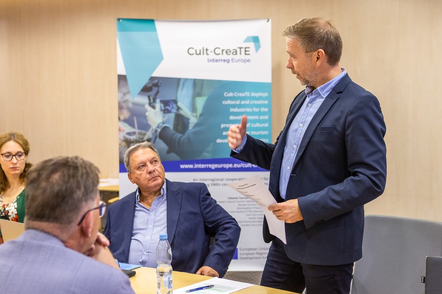 W Urzędzie Marszałkowskim podsumowaliśmy (14 września) w międzynarodowym gronie projekt Cult-CreaTE (Interreg Europe), którego celem jest upowszechnienie turystyki kreatywnej i kulturowej. Spotkanie odbyło się w trybie hybrydowym z udziałem partnerów z Grecji, Łotwy i Węgier, których gościmy w Toruniu, oraz z Irlandii, Cypru, Włoch i Szkocji, którzy w spotkaniu uczestniczyli online.