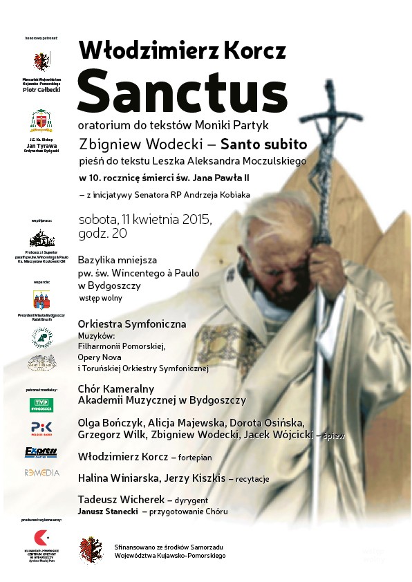 W najbliższą sobotę (11 kwietnia) zapraszamy do Bydgoszczy na zorganizowany przez samorząd województwa koncert „Artyści Janowi Pawłowi II w hołdzie”. Zabrzmi oratorium „Sanctus” Włodzimierza Korcza. Patronat honorowy nad wydarzeniem objęli marszałek Piotr Całbecki i biskup bydgoski Jan Tyrawa.