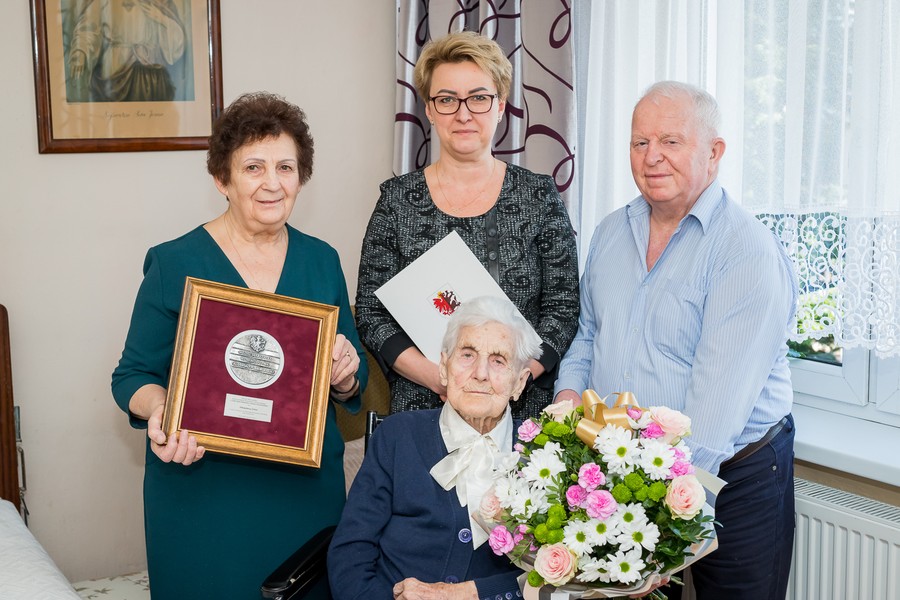W tym roku będzie obchodziła swoje 107. urodziny! Pani Władysława Urban urodziła się w październiku 1915 roku. Od zawsze związana z naszym regionem, dorastała w wielodzietnej rodzinie na gospodarstwie w powiecie sępoleńskim. W 1941 roku wzięła ślub z Teodorem. Para wspólnie wychowywała córkę i syna, zamieszkali w Sępólnie Krajeńskim. Seniorka zajmowała się opieką nad domem i dziećmi, czas wolny wypełniały jej robótki ręczne. Medal Unitas Durat wręczyła jej wiceprzewodnicząca sejmiku województwa kujawsko-pomorskiego Agnieszka Kłopotek. Pełny biogram.