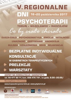 Bezpłatne konsultacje terapeutyczne, warsztaty i prelekcje praktyków psychoterapii składają się na program V Regionalnych Dni Psychoterapii (16-20 października). Spotkania pod hasłem: Co by ciało chciało, odbędą się Toruniu, Włocławku i Radziejowie. Współorganizatorem jest Urząd Marszałkowski Województwa Kujawsko-Pomorskiego.
